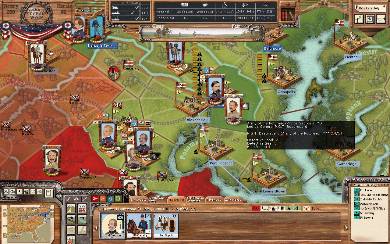 (I thought we were gonna fight First Bull Run, but Beauregard just went right past us! Turns out it was just his HQ unit, everybody else was blocked across the Rappahannock like my troops were. Too bad for him, though. I have a free cav unit just to the north of Prince George.