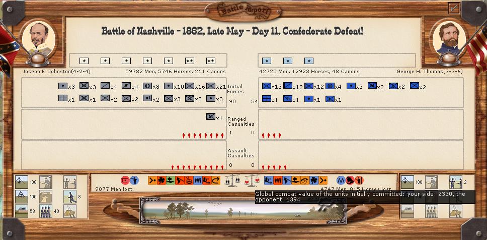 So...in essence...what happened was Thomas advanced on your position in Nashville, your two Corps were probably out of position and hurrying to a place where they could support Johnson....they managed to make it....but were very tired and disorganized by the time they reached the field....not to mention insufficiently commanded.....were ordered to attack anyway.....into a hail of Union cannon....in the middle of open terrain....against an enemy that was better rested and probably a little better led. By the time they closed range...their cohesion was already so low that it would not be long before they began to route. Sure enough....the Union advance's momentum was too much for your tired Corps' to handle...and voila. a Union victory.