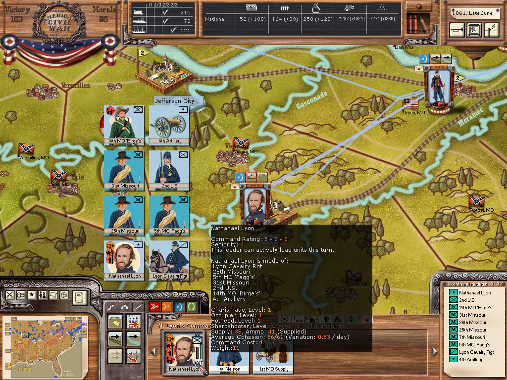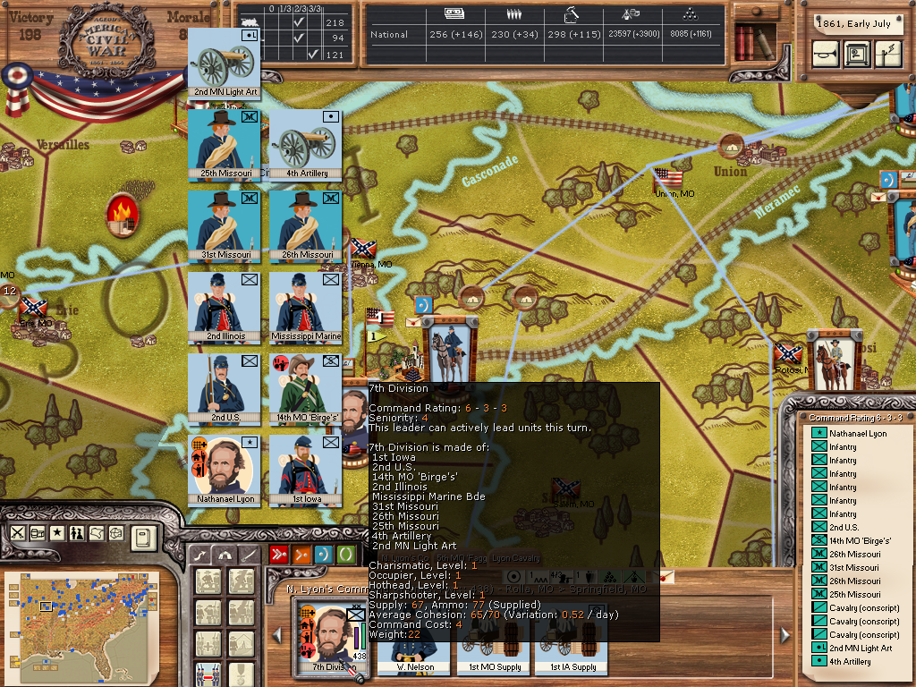 But I've encountered another issue. In my current game Lyon has formed a division at Rolla Mo with a number of Militia Regiments, Sharpshooter Battalion, some Regular Infantry (Lyon's lone company;-)) and Artillery and his Regular Cavalry Regiment (guess these are the four regular companies he had with him at Wilson's Creek). So all his units are regiments. I formed this division the previous turn and it received the number 7 (3 being Hooker's in the AotP and 6 Wood's under Banks and Patterson), yet now it doesn't show a number, but still seems to act like a division (I was able to attach additional units this turn). So I'm not sure whether there is just a naming problem or whether this is a remnant of the previous dissolving divisions...