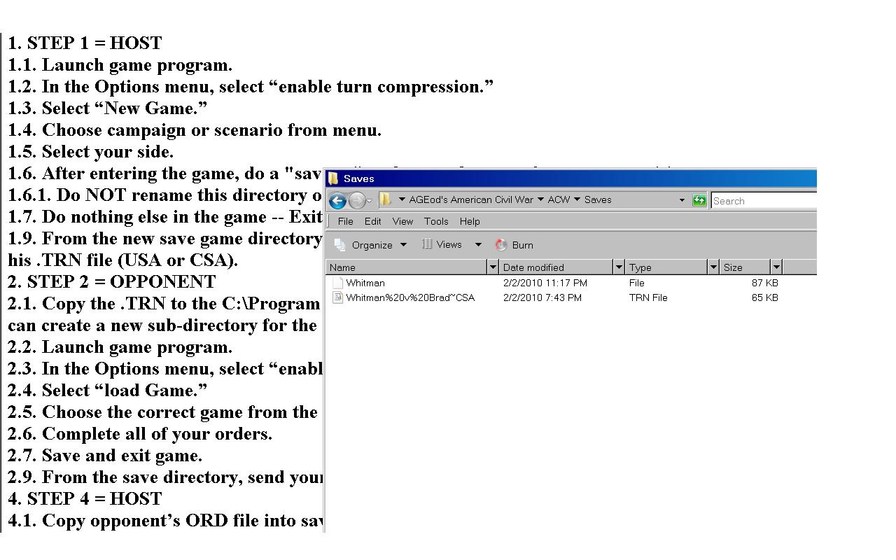 Jim-NC wrote:You could try changing the names of the files involved. For example, when Whitman saves your sent ord file to his directory, he can rename it (to remove the %20, and replace with a space). I am guessing that your orders from turn 1 did not make it to him (or are sitting there unused). He probably executed with Athena taking over your side. IIRC, when that happens, there is no .trn file for the non hosting side (they are placed under the AI turns). This would mean, that no file to send. Also, he would not have used your orders. Have him look at his backup folder, and see if your old file is there. If he renames, it should work, and create a .trn file for both sides. (No guarentees).