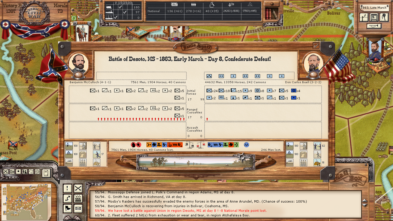 So the scenario might be: McCulloch is deserted by his fellow divisions with his back to the Tallahatchie in winter (which means mud=poor mobility) and without pontooners. Upon Buell's arrival to Desoto his corp immediately controls the entire region further restricting McCulloch's movements and making his deploying into a battle line very difficult and limited. Buell's rank as Lt. Gen. gives him a further advantage over McCulloch (still Brig.Gen?) on the number of regiments he can fit into his battle line (see the Frontage threads). But wait, it get's worse, because Buell is in Defensive Posture with a defensive rating of 2, which although modest is better than McCulloch's Offensive Rating of 1, and give Buell an even larger frontage advantage over McCulloch. Buell's force being in Defensive Posture means they may take advantage of any terrain features and entrenchments they might have been able to dig out, but open terrain leave little to hid behind. It does however make for great visibility for his 242(!!!) artillery pieces. When McCulloch orders his attack, and Cold Harbor was a cake walk in comparison, his entire division is shattered and routed by Buell's artillery (all losses are ranged) (on the left side next to the man running away is the number of elements routed: 17 which is the entire division; count them if you will). Most, not being able to exit the region fast enough are captured (the icon on the left with a man being guarded by another man at bayonet point shows 62: 62 companies @ 100 man each = 6200 men taken prisoner. The number below that is supply elements and cannons captured in their WSU values, also most of them. McCulloch survives thet battle wounded, but should be summery court marshaled, hung and then shot.
