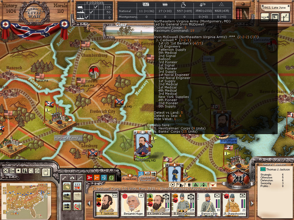 I wonder, does the ai really know how to use support units? This is the second time during this game that I see the ai's Army of the Potomac marching around with a bunch of medical (5x), pioneer (5x) and signal (2x) units, not to forget the naval engineers (2x). Maybe my presence so close to it's capital (strongly dug in at Alexandria) is affecting it, alternatively it just doesn't know what to do with these units.