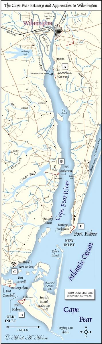 The middle of the three roads leading east from Wilmington terminates millimeters off the edge of the map, at a harbor town called Seagate, at the south end of Masonboro Inlet. There should have been another fort built there, but wasn't. Not a great harbor like Wilmington, but certainly usable for landing troops and supplies. I believe it probably wasn't used because planners on both sides considered it too close to Wilmington for military use, a fast reaction force could get there in about 2 hours marching, and the Federal generals didn't realize the weakness of the Wilmington garrison. (Plus they were fixated on the fort, kind of an 'If you build it, they will come.' scenario).