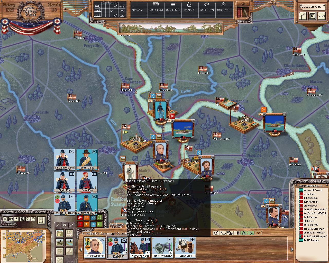 So while Halleck is in supply generally (there is even a railroad crossing the river, or is that a graphical glitch?) he doesn't get any replacements because of his location "somewhere in the wilderness"? So generally this would affect McLellan in Hixmen as well (I don't know the size of the city over there at the moment), right? Mmh, I will have to plan my campaigning from (bigger) town to town then (and build some depots), especially in the west.