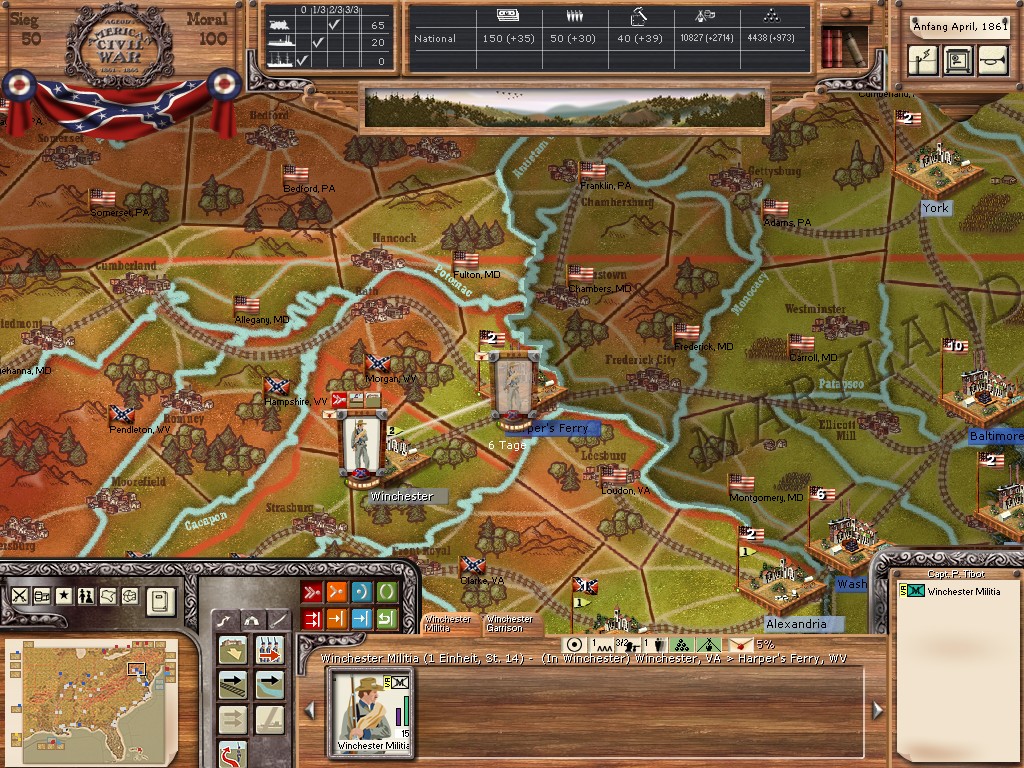 In this thread Mr. James Longstreet (my enemy) challenges the south and he says that the North don`t accept the Conferderacy :w00t: This leads us to PBEM AAR where I will give my impressions as good as I can from the southern side, played is version 1.11e in german, I will try to write my complete AAR in english and always with pictures :w00t: