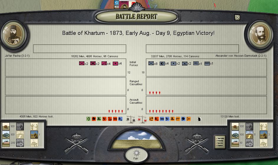 In a hasty crossing over the Blue Nile river, General Alexander von Hessen-Darmstadt attempted to quickly take Khartoum from a smaller sized garrison. The garrison proved to be stronger and better prepared than German intelligence assessed. The general stated he will return soon and will not underestimate the Egyptian defenders next time.