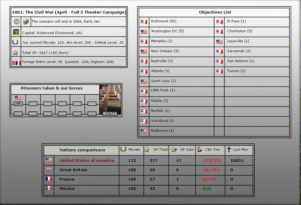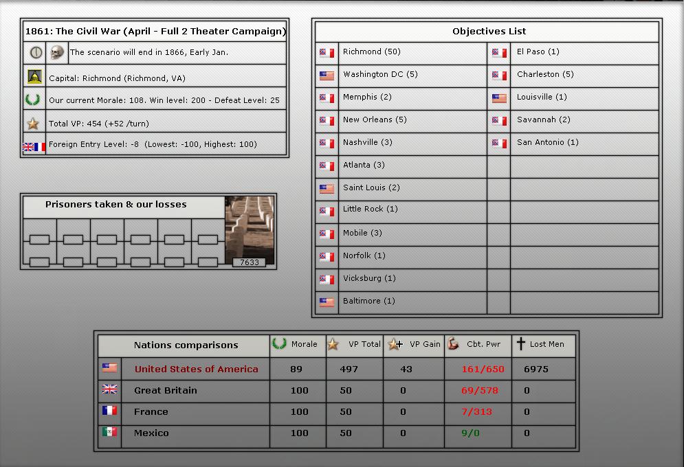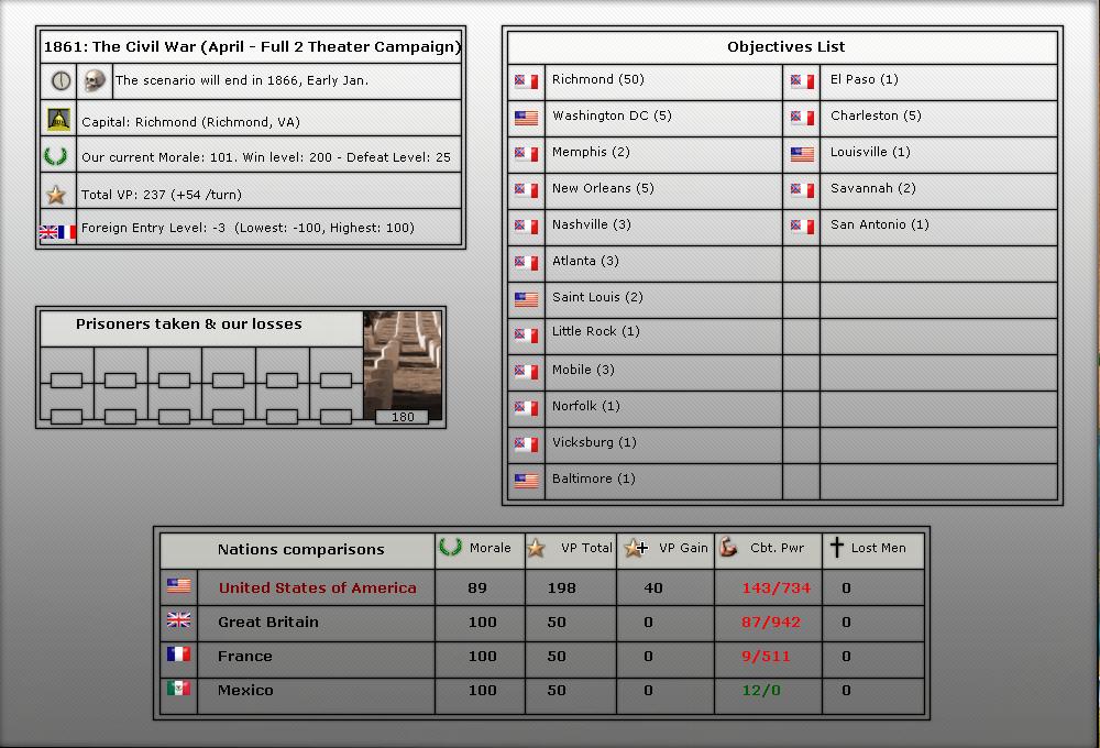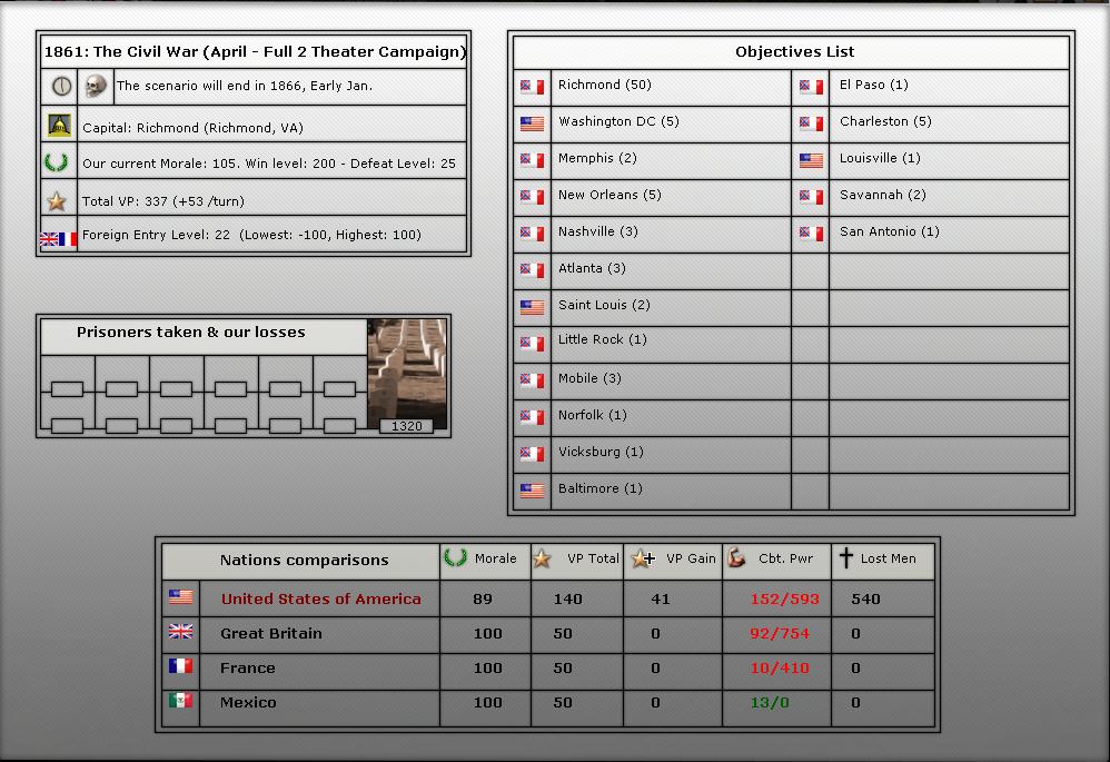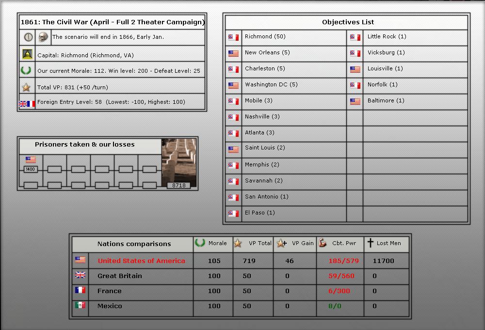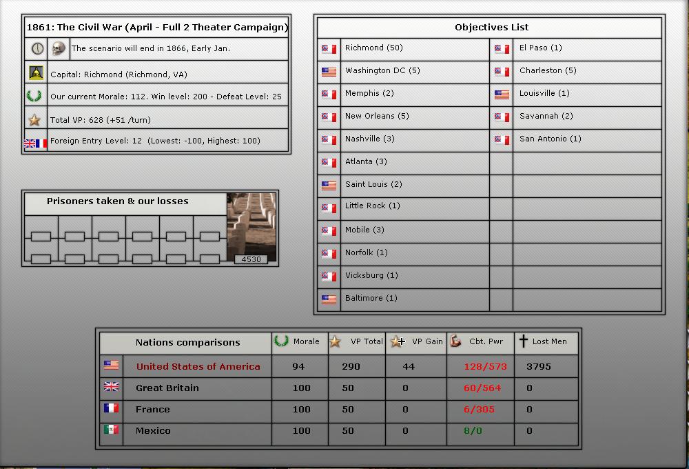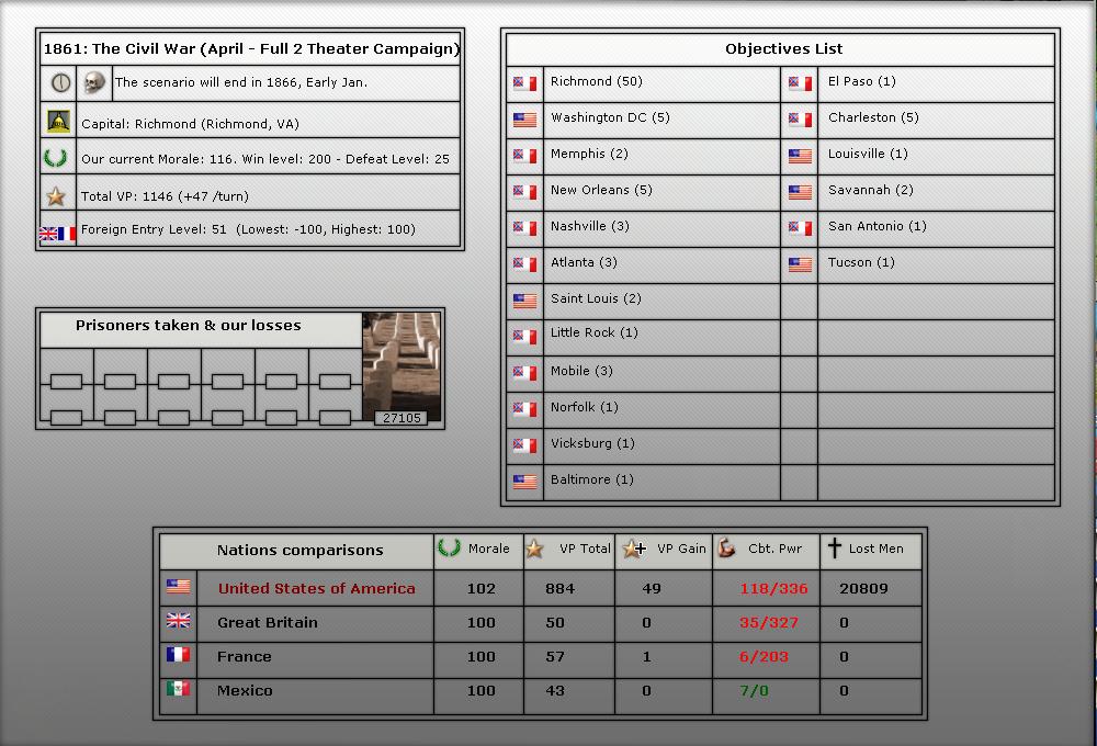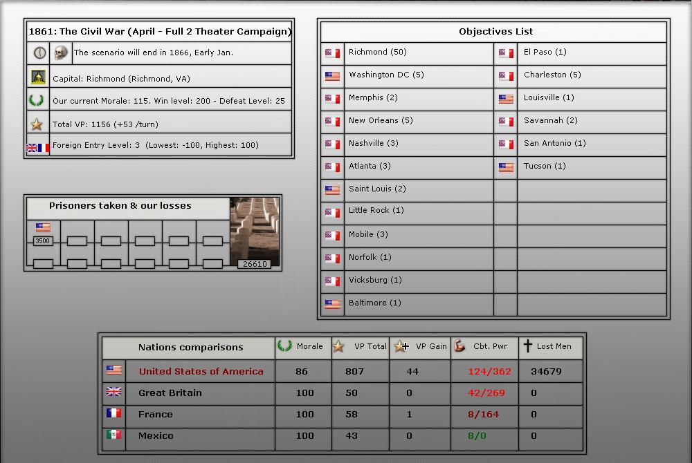 4. We will be starting in April of 1861 (long game). We will play upto 56 turns (April 1861-July 1863).