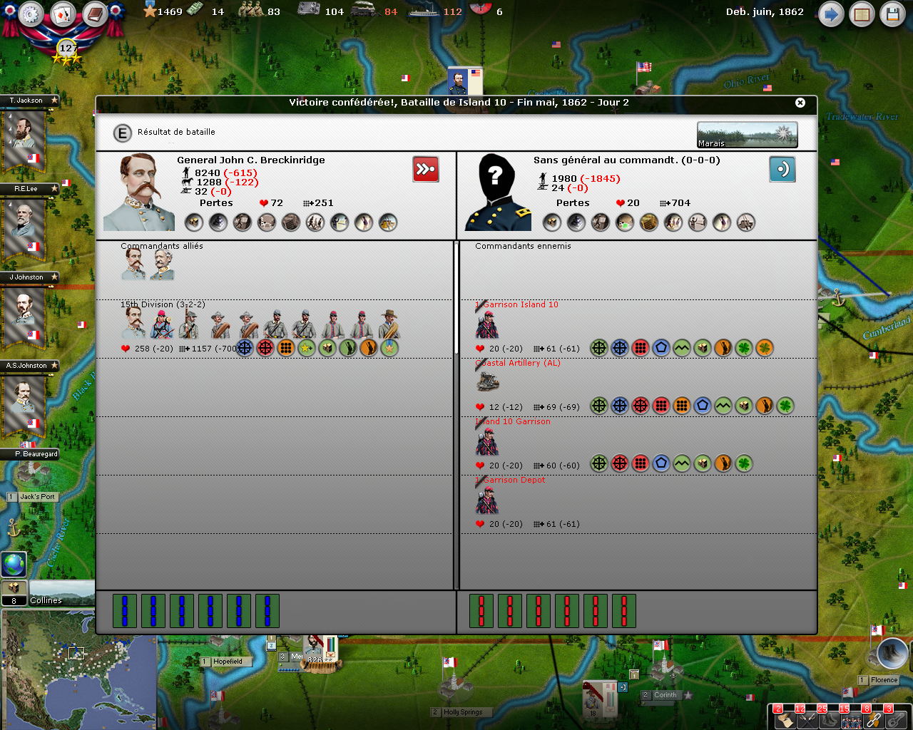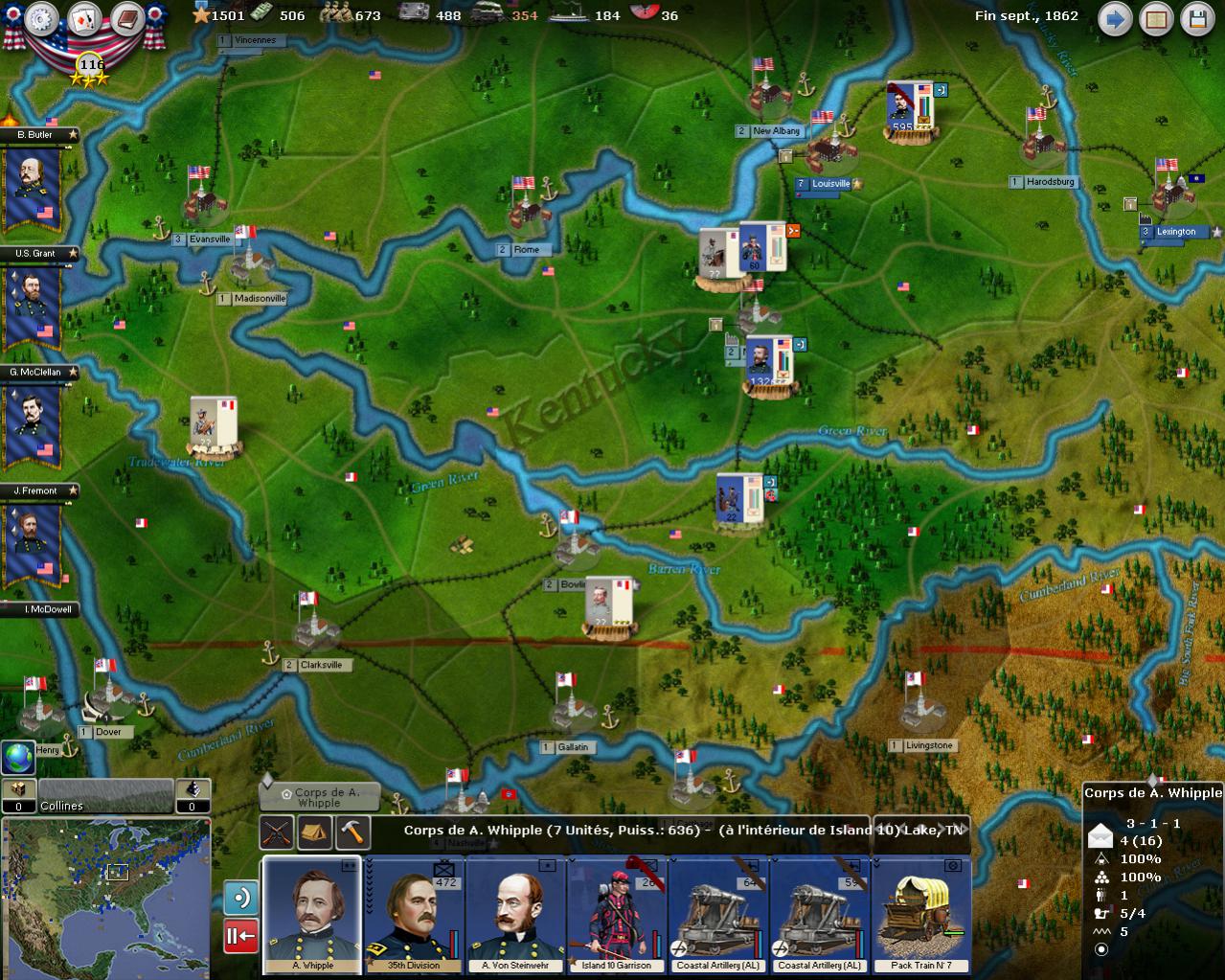 Without Grant and his army Kentucky was a state wide stalemate. I left a strong garrison at Island 10 (conquered by Grant) ensuring control of this portion of the Mississippi and McClellan remained at Louisville KY facing Beauregard’s army at Bowling Green.