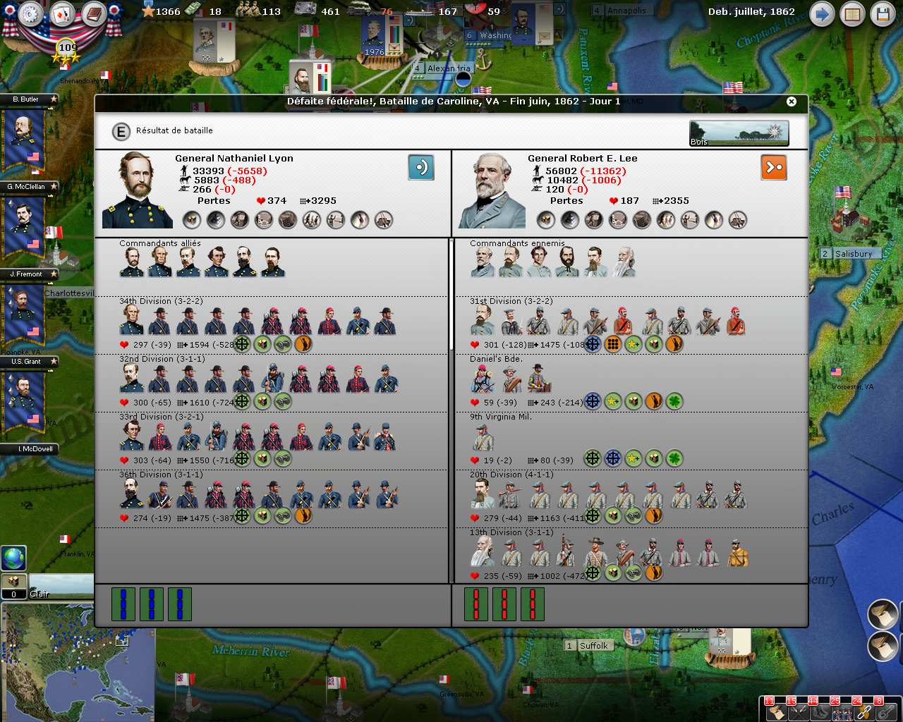 In my game as USA, the west saw a lot of actions and the east a little. In this game as CSA it’s the contrary: the eastern front saw a lot of actions (as described in my previous post) and the west less.