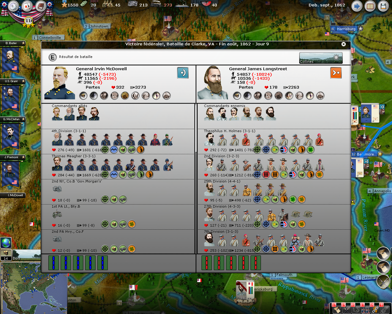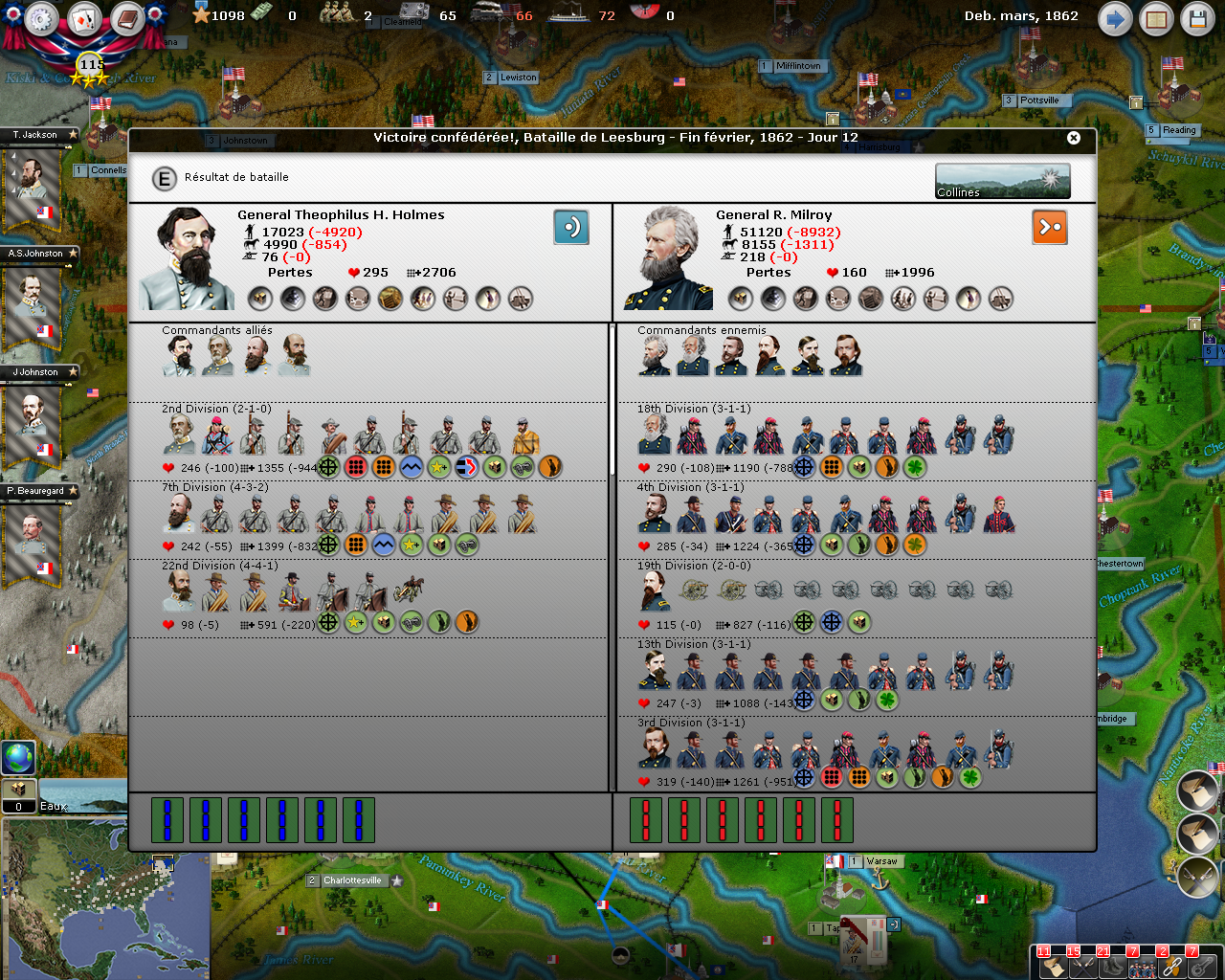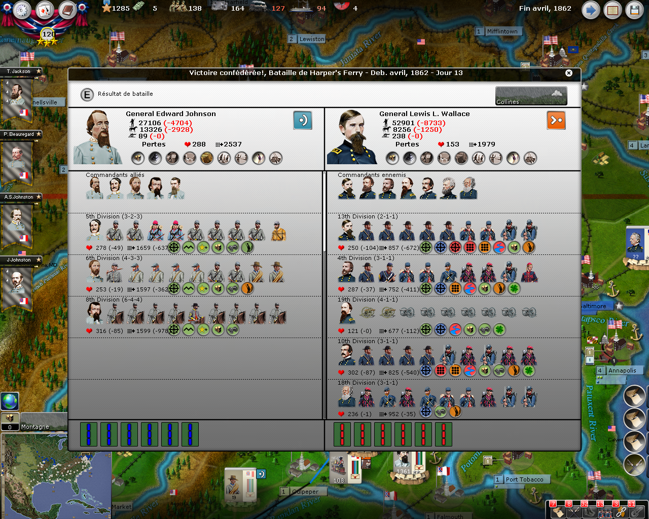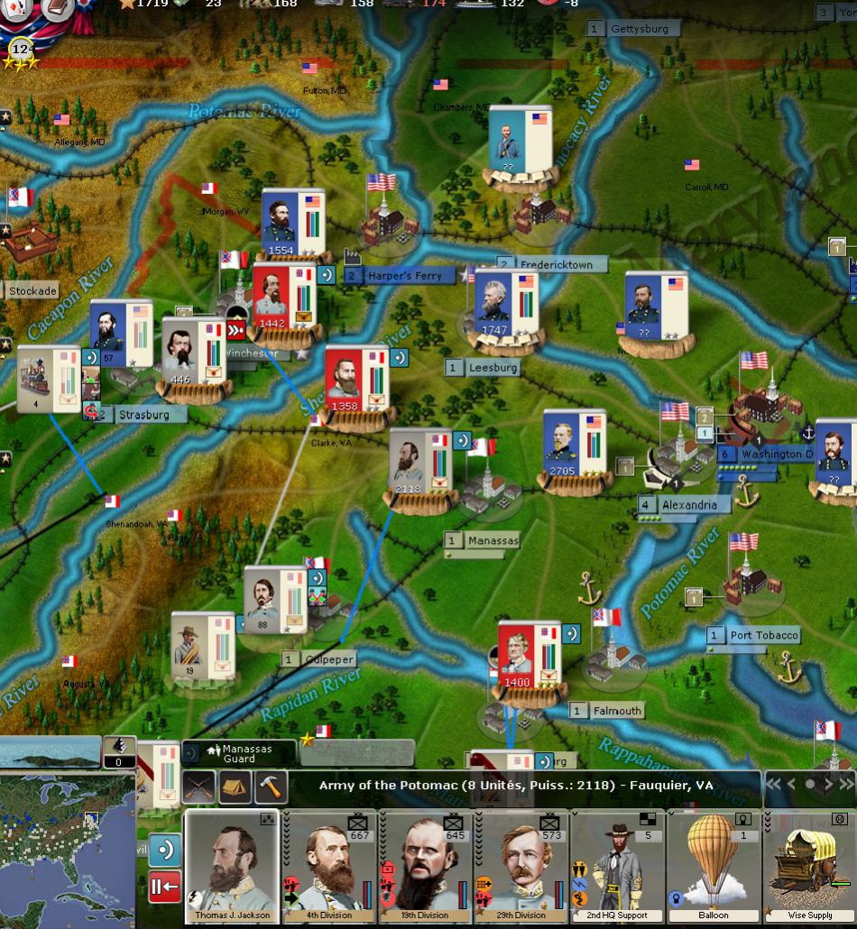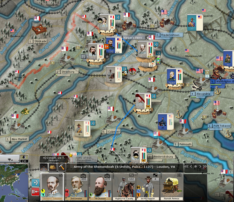 I enjoyed some success, including the starvation of an entire USA’s division cut from its supplies sources by Shelby’s cavalry division and Johnston’s victories at Winchester and Hampshire WV.