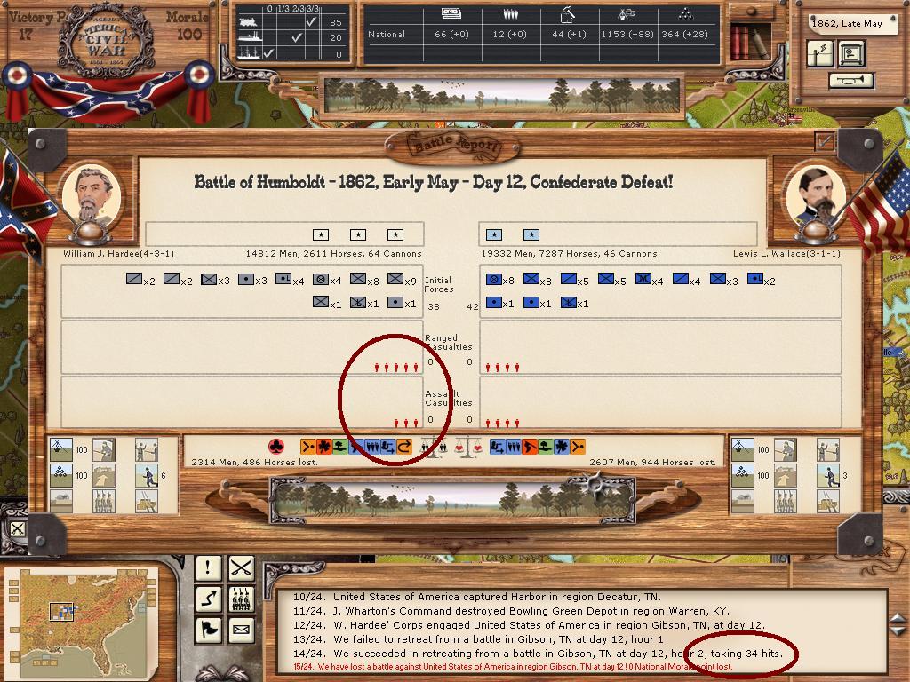 After Bragg nailed Wallace in Decaturville, he marched behind Wallace into Ft. Henry. The following battle occured. From the results, it looks like Wallace fled at the 2nd hour, and took an extra 17 hits for it. It does not look like there was any MTSG during this battle.