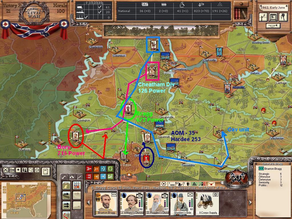 I have color coded the moves. Beauregard ([color="Red"]in red[/color])will move to Memphis to take over the Corps (I plan on making a division with Breckinridge). The Hindeman Brigade will march to Memphis to join old Bory (in [color="Yellow"]yellow[/color]/black). Polk with a Militia unit(who is not a good leader in my opinion, is moving to the AOM to assist AS Johnston ([color="Navy"]in blue)[/color]. Brewer's Cav will move to Ft. Henry to help hold it (it is a strategic city after all). Hardee's Corps will hold position (due to Grant being there). Bragg will hold position to recover Cohesion and help Hardee (via MTSG). A note: I have moved Bory to Memphis, as this is the union objective, and I really need to hold it.