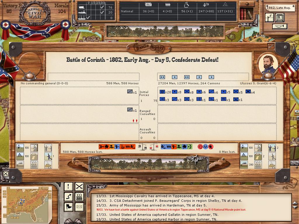 1st battle - Corinth. My calvary unit met the entire army of Grant, with predictable results. See below.