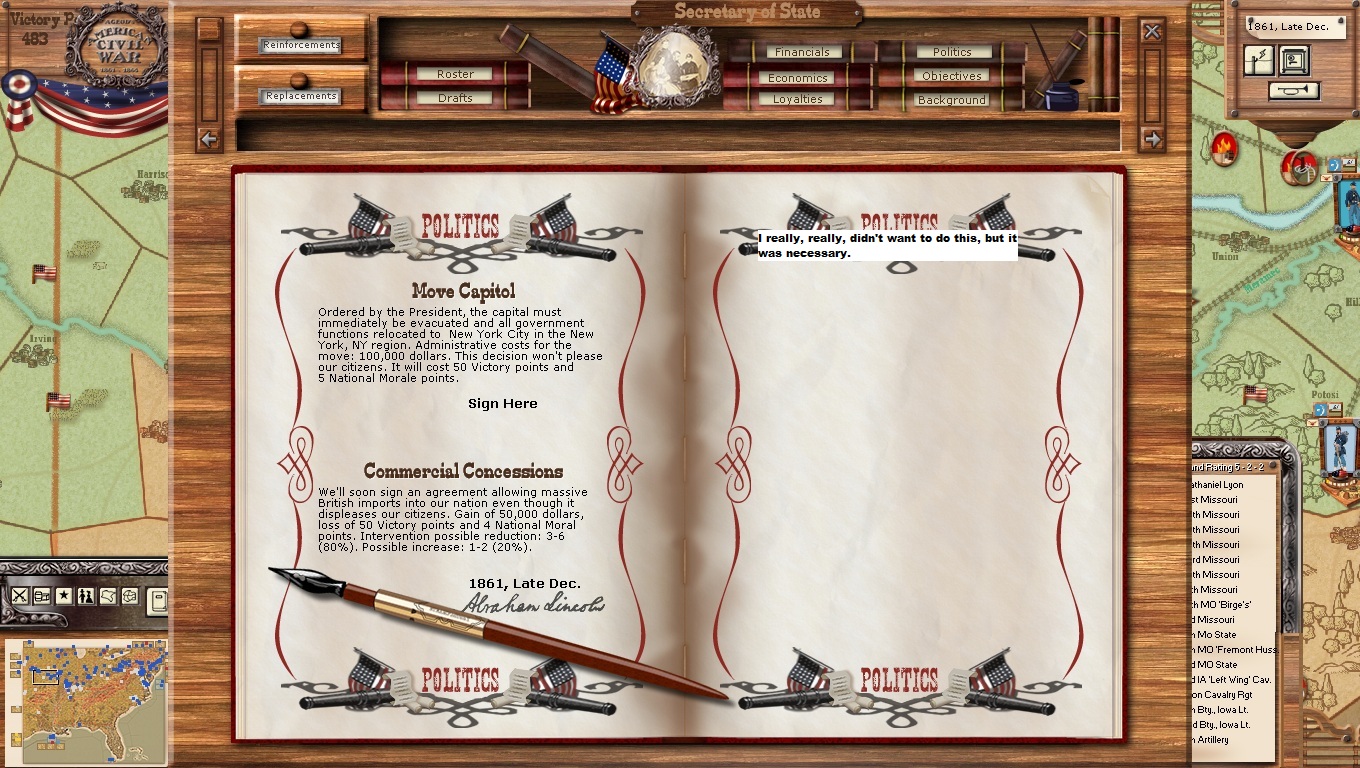 3: Build up a naval/arny force at Cairo and seize both Columbus and Paducah in October. Unless I can steal a march and take island #10 or Ft Donelson...... wishful thinking that.