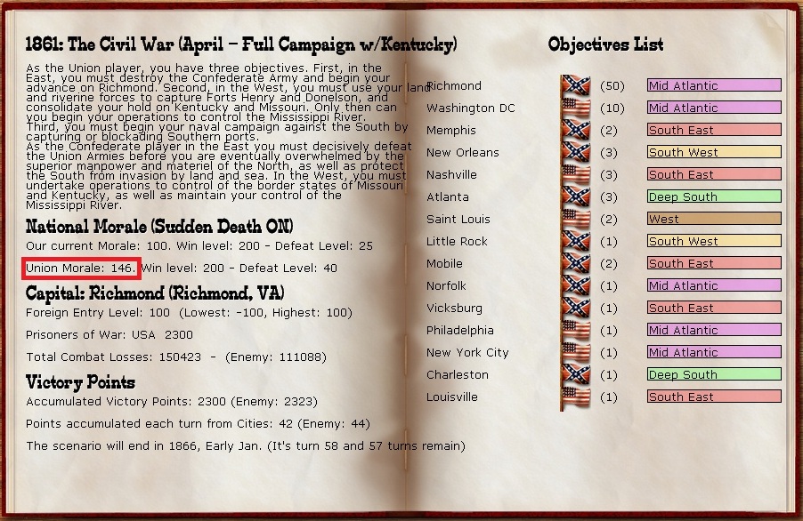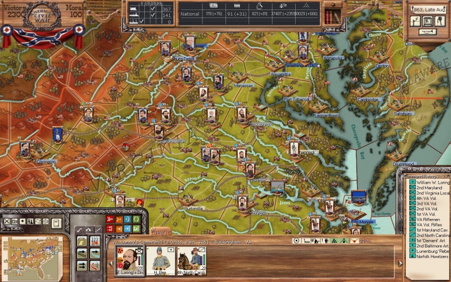 I’ve done better here than out West. Held Manassas long enough to make the Union take the NM hit and have been counter punching where I can. Jackson sits in the crucial region of Culpepper with a corps at 1,611. Holmes’ corps is at 1,135 and Longstreet sits in Fredericksburg at 1,187. I had intended to build a fort in Richmond, and I paid dearly for not doing so as the Union III Corps led by Dan Butterfield end arounded Holmes and raided Richmond in force three turns ago and the bottom dropped out of my NM (hmmm, did I say I was doing better here than out West?) :blink: . I managed to recapture Richmond the next turn and chase him out, but I’ve tried twice to attack him since and both times have gotten creamed, losing 12 NM between two battles. Of course, John Bell Hood was in charge, so what do you expect? Butterfield’s forces aren’t getting supplied so I may try one more attack. The Union has not tried to land on the Peninsula nor have they bothered to raid the coast.