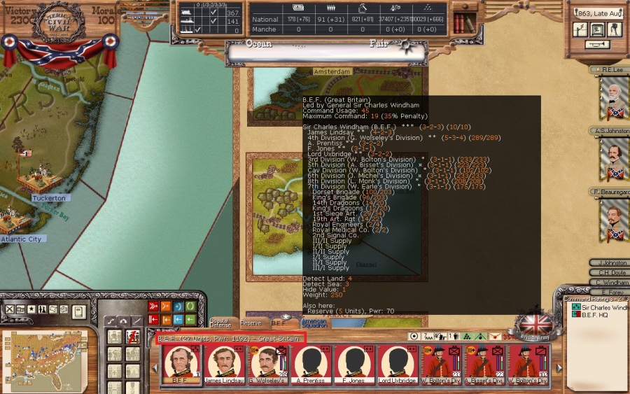 The BEF will arrive next turn to a yet to be disclosed location with orders to amphibiously assault. I’m anxious about how their cohesion will hold up, and picking an obvious place to land which might therefore be well defended could have disastrous consequences. So I have picked a spot guaranteed to be a thorn in the Union side but it shall remain a surprise for now.