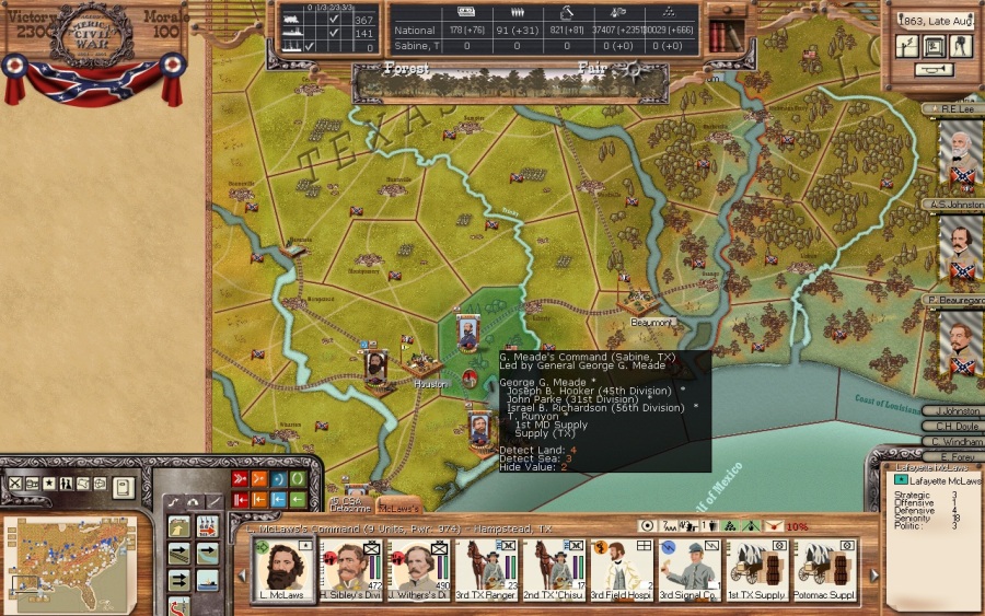 Beginning in Texas. The Yanks invaded Galveston months ago and captured all of the state with the exception of Houston. They assaulted McLaws’ forces two or three times and were bloodily repulsed each time. The Yanks have been reinforcing, but mostly just sitting there. I'm happy to have Thomas and Meade cooling their heels in Texas rather than making trouble elsewhere. Since they were staying put, I sent out cavalry forces to take back Dallas and most of the rest of Texas and I sent a relief force from Louisiana as a feint which had the desired effect of rattling my opponent. Here is how things look with McLaws’ corps at 974 power facing off against the Union hosts.