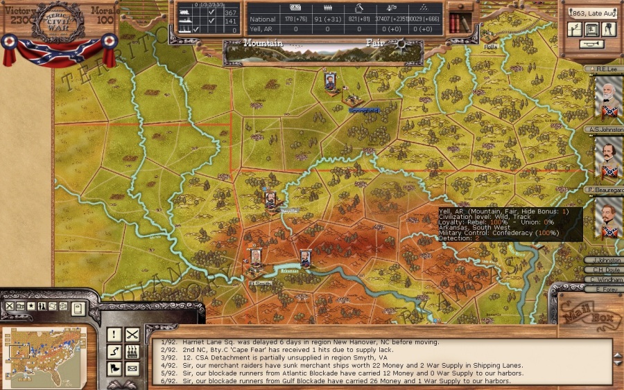 Missouri. Not much has been happening here. Standard opening by Lyons to grab Rolla and then Springfield. Price and McCulloch in Fayetteville have been staring down Freemont in Springfield and the Yanks have not tried to attack, though they recently sent a cavalry probe south of Springfield and Price had moved to intercept and protect Ft. Smith.