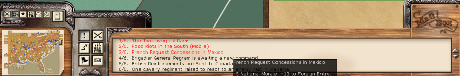 First, a little good news as A. Bezaine’s forces captured Mexico City! Battle opened on day 1, and continued with three more battles concluding on day 13. The Ejercito de Mexico (the Northern Mexican Army, i.e. The Bad Guys) has left Chihuahua and took Laredo so Chihuahua and its depot are open if our valiant French forces wish to secure all of Mexico. Thomas and Meade continue to sit tight and my guess is that the Ejercito hombres are going to join them and try to take Houston finally.