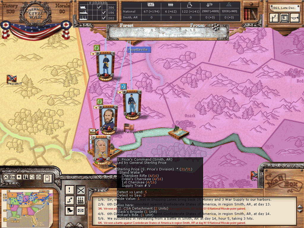 Trans-Miss. still is the Union's showpiece, Lyon marched south to Ft. Smith in hope of capturing it before winter, but ran into Price on the way and could not take it yet. Sumners Division with two supply wagons reached Fayetteville, a depot should be in business there, soon. However, I do think I'm putting much more effort into this department than it is worth at the moment. But then again, I gotta be successful somewhere, don' I? :sourcil: