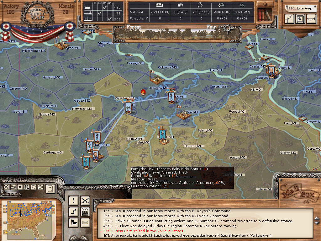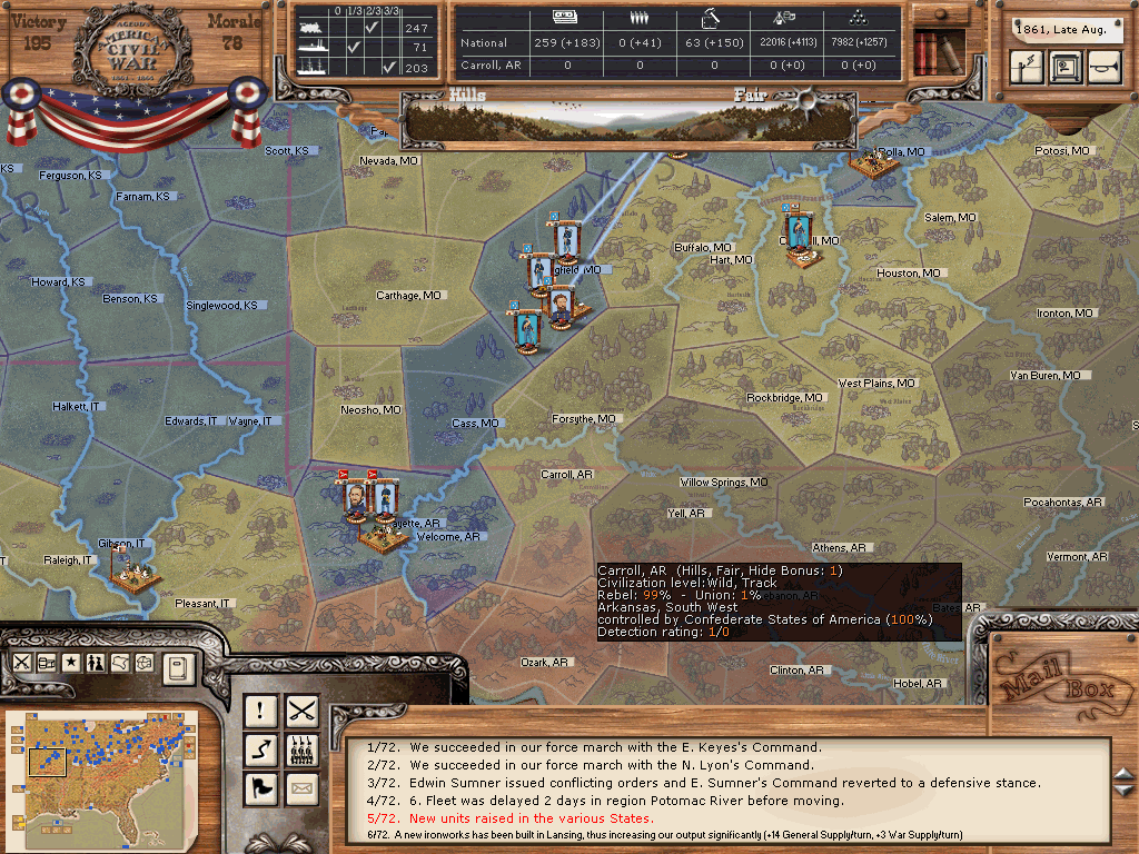 I was quite successful there, all cities in MO except the small town of Charleston are firmly under my control. Two divisions (one inf, one cav) under Lyon andhave been built and already taken Fayettecille/AR during the last turn, a third under Sumner is currently assembling at Springfield (those forces consist mainly of regulars formerly guarding the western territories plus a few newly raised brigades). An additional force of MO militias is strolling around to convert railroads to union control.