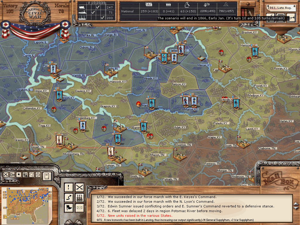3.) North-west: gather enough troops to build at least one corps each at Cairo/IL and Louisville/KY, apart from that, respect Kentuckys „neutrality“ as long as possible. Build enough militias to garrision all towns and harbors in IL, IN and OH.