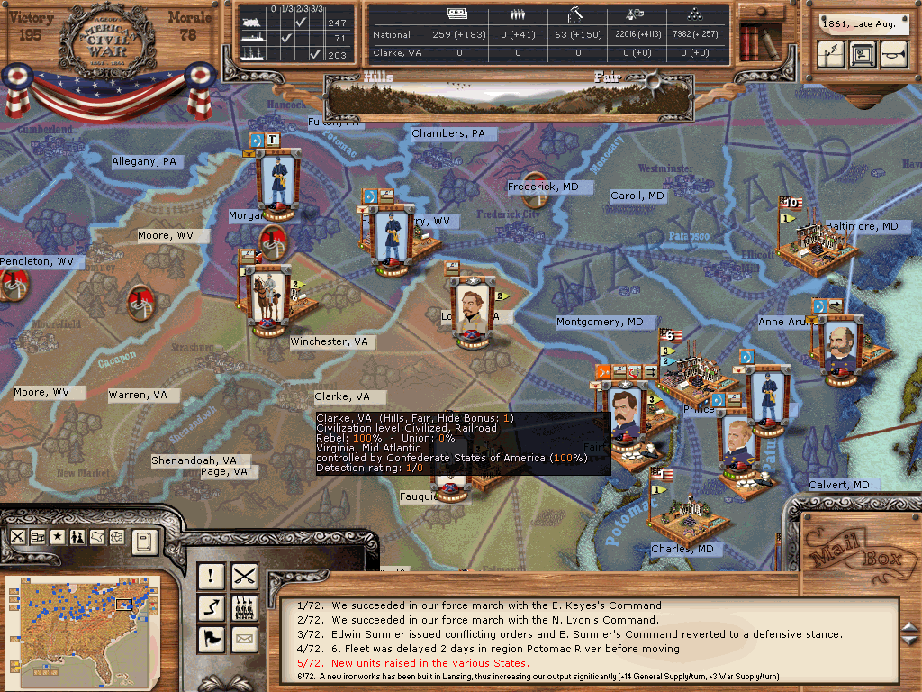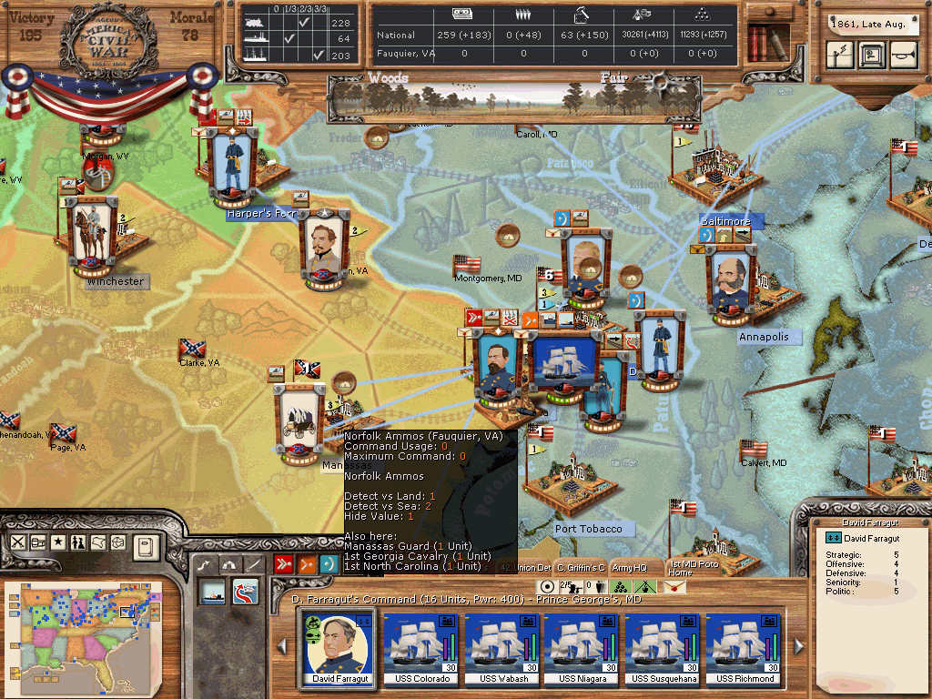 4.) Virginia/eastern coast: Flesh out the AotP to at least three corps with 2-3 divisions each, one corps each at Harpers Ferry, Alexandria and Fort Monroe. Build one cavalry division under direct control of the army for recon and a bit of raiding.