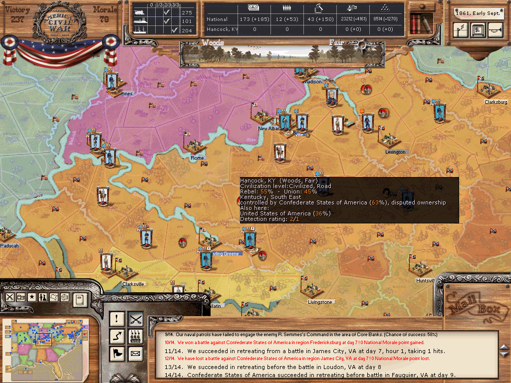 In Kentucky raiders continue to be a nuisance, especially one small division under McCulloch in the eastern part of the state. We managed to liberate Lexington, but lost Bowling Green. I guess I will be forced to gather a real army and talk business there soon.