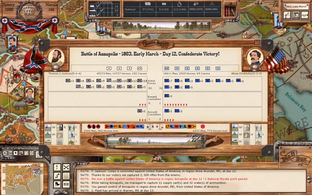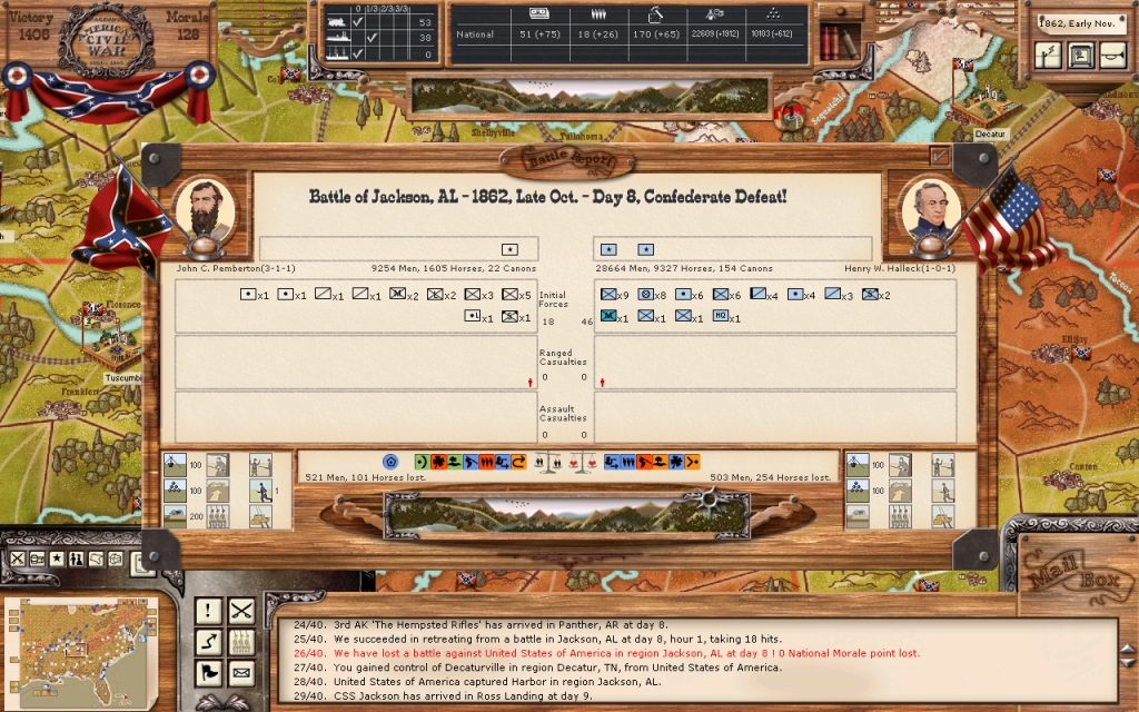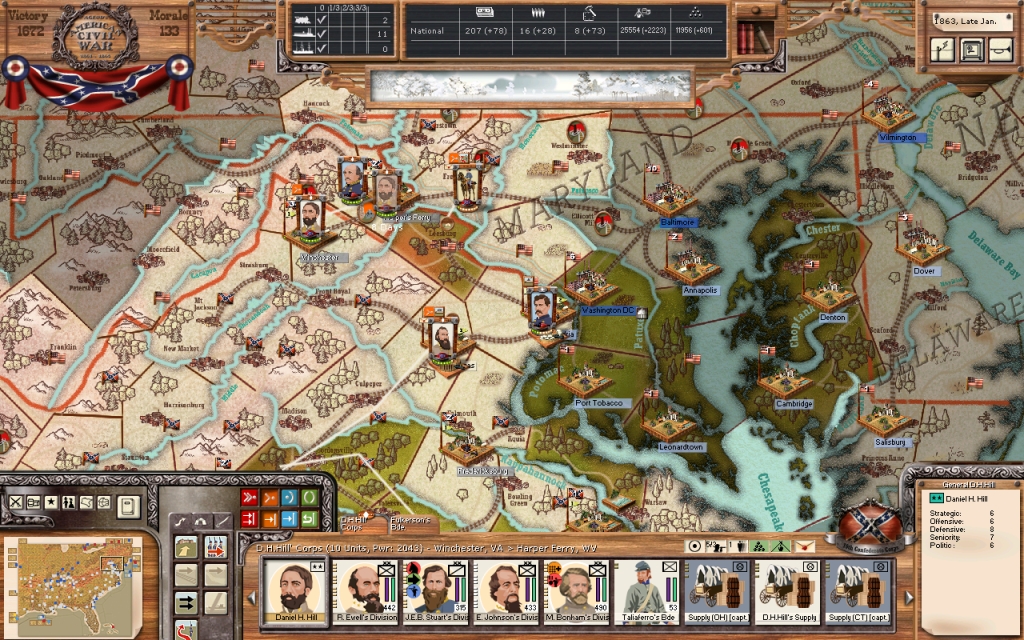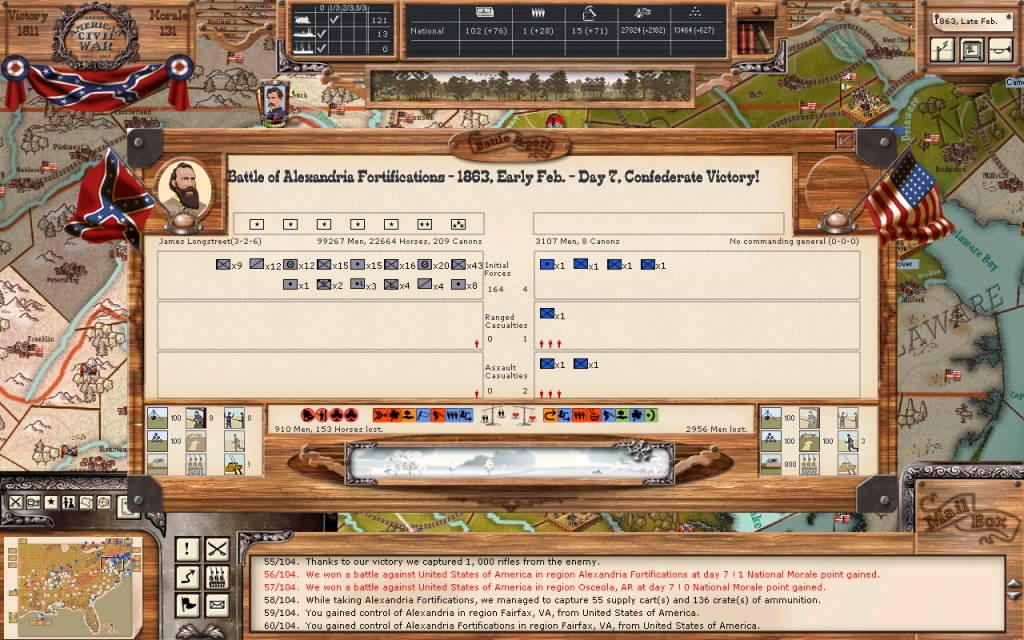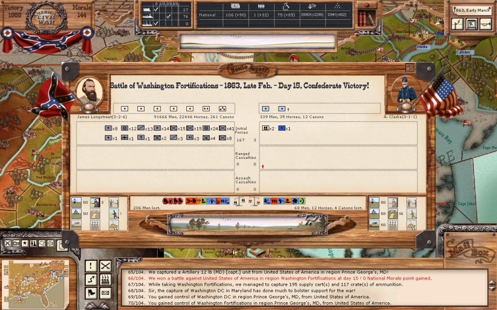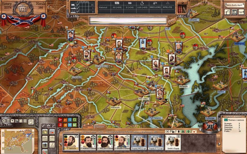 In that time, I have taken Nashville, Washington DC, and Baltimore while holding Memphis, New Orleans, Savannah, Wilmington, Richmond, Mobile, Atlanta, anc Charleston. I would call it a very successful run.