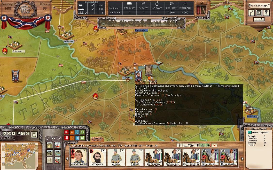 The attack on Ft. Smith ended in a quick and colossal failure. There were 2 regiments there instead of 1. The attack was over about as quick as it started. However, the Union force has been weakened, so I’m going to try to attack it again this turn but this time on conservative attack. There will be two attacks, one from Quantrill and another from a cavalry regiment and Indian regiment coming from Dallas. Lyon’s army and McPherson’s corps did make it to Little Rock, no doubt to start recovering. In Texas I’ll send a regiment from Galveston to Dallas to fill in the gap left by the departing cavalry.