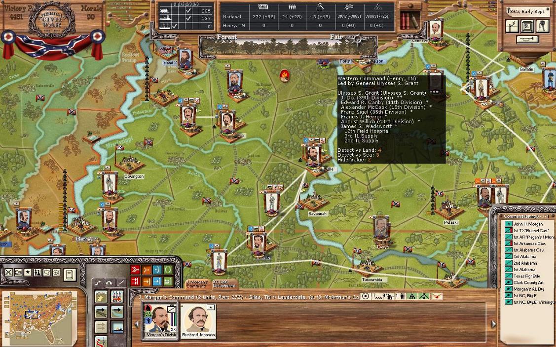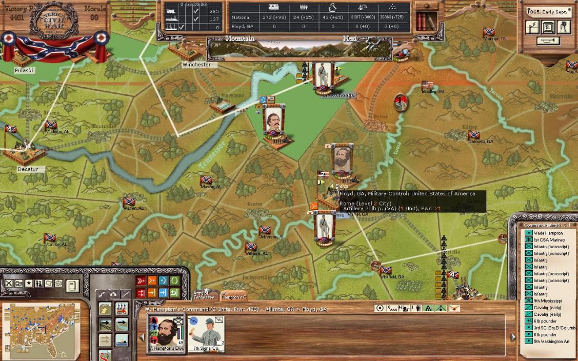 Grant didn’t attack, the first time in a while. Hampton in western TN won a battle and eliminated 25% of the Union force. Apart from Island 10, Ft. Henry, Carthage, and Knoxville, the CSA controls TN. Hampton will go for Knoxville this turn and then double back towards Atlanta. A brigade will leave Chattanooga and also go towards Knoxville. A regiment from Pulaski will go south to fix a RR next turn. In western TN, I’m doing some transferring of the artillery batteries from Hill to Bee, Magruder, and Ramseuer to balance out the forces. Grant’s power is back up to 1,400. Morgan will go to Nashville to join Polk’s corps in Memphis.
