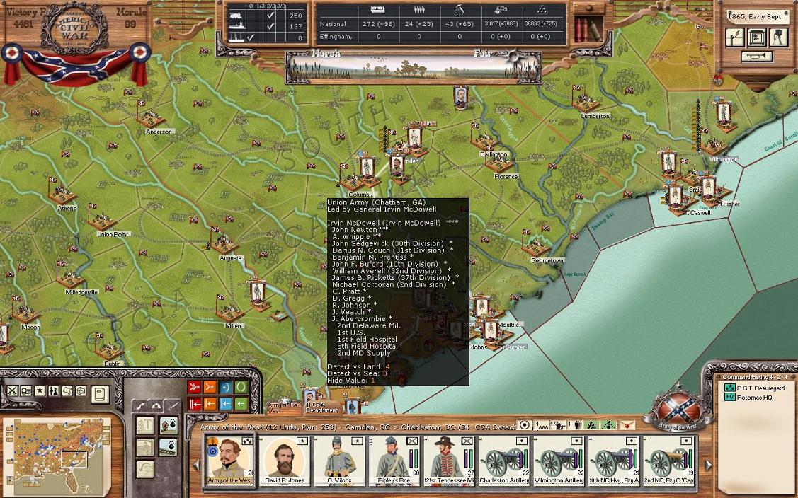 charlesonmission wrote:The other large campaign by the Union this year has been the Vicksburg/Jackson, New Orleans, Mobile, Atlanta, and Montgomery actions. In the end, none of these objective locations and strategic places came that close to falling into the Union’s hands. The reason isn’t that the Union didn’t have the forces, they do. However, if you remember my original posts at the beginning of the AAR, you will know that I put a high value of contesting the Mississippi River. I’m currently reading the book Vicksburg 1863 and am really learning to have a better understanding of the significance of the Mississippi River. This was something that Grant saw early on historically. Since I control with coastal artillery the positions of Dyer TN, Memphis TN, Vicksburg MS, and New Orleans LA, a movement that bypasses these will run into supply problems within several turns. The Union has taken huge supply hits on many of these campaigns. I think the Union thought that it would find the interior lightly defended. However, a sole division that is well supplied, well lead, and dug in will hold off superior forces at least once. And this is the essential point, the Union can’t wait around to attack again as suddenly supply starts to run out.
