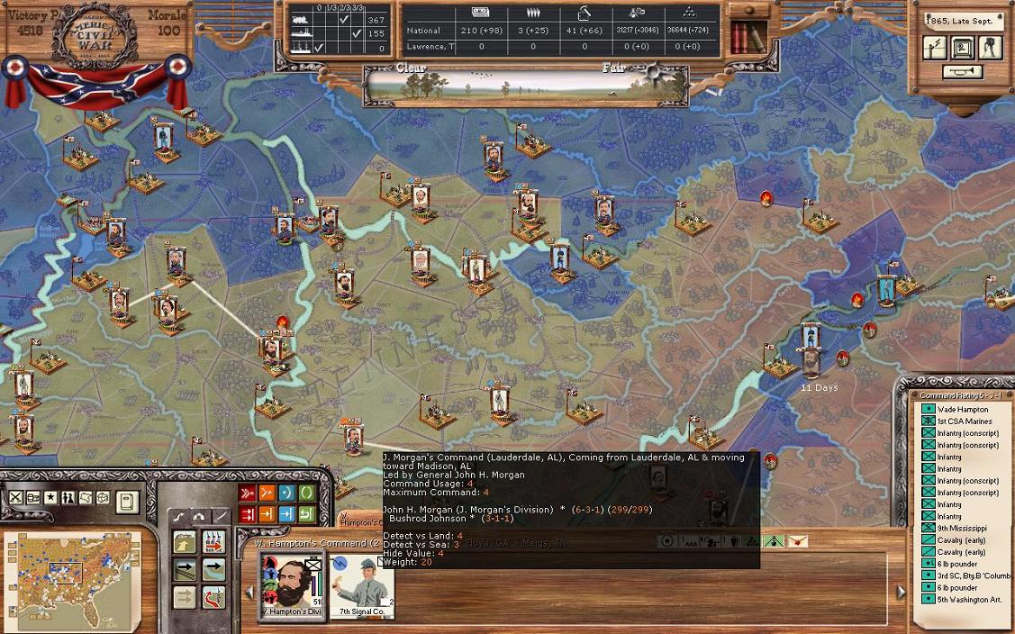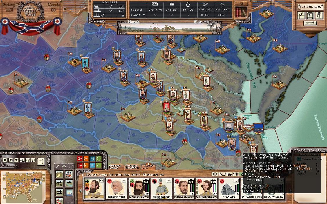 veji1 wrote:ah well then, I suppose the game has been adjusted so that militias aren't an exploit anymore. In that regard your army size doesn't really look out of whack. One I dislike later on in the game is the lack of divisions, it doesn't really make sense. I always modded the game so that the CSA got 50 and the USA 99, to avoid having an endgame with stacks of uncosolidated troops walking around...