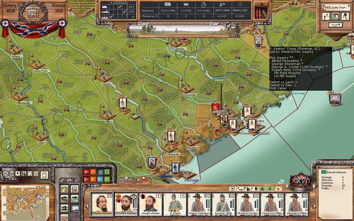 There were 3 Union moves. The fleet left Savannah. A division left Savannah and took Augusta. And Kearny’s corps takes the un-garrisoned Camden. You can see that Charlestown is loosely surrounded. Kearny’s corps (low on supplies to the north in Camden). Sedgwick’s division in Augusta to the west, and 5 division to the SE in Savannah. However, Charlestown has 20,500 men with 85+ cannon. Even if the Union could bring them all together for a coordinated attack on Charlestown, I think the city would hold. I’m surprised the 5 divisions stayed in Savannah, but there they are.