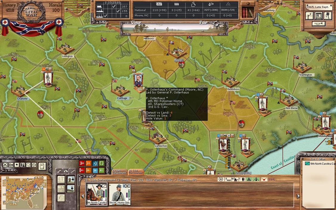 There was a naval battle on the James, which the CSA won. My cavalry regiment took the towns of Covington, Pulaski, and Smith. This turn they will go to Johnson City TN. No big Union movement. 2 divisions are still next to Norfolk.