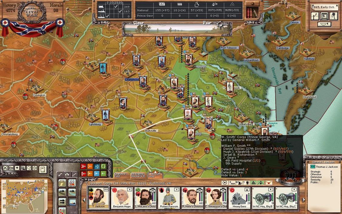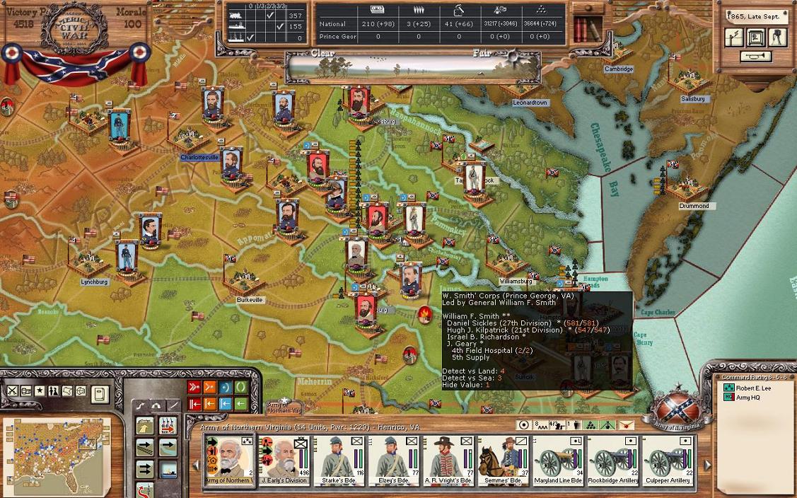 To briefly review, the Union made a strategic decision early on in 1865 to give up on attacking Richmond. The Union had lost a number of battles in the overland campaign of 1864, but had pushed the CSA all the way to defending the gates of Richmond. I was surprised by the Union move to give up on Richmond for two reasons. One, I felt like the Union was winning, albeit slowly. And two, although Mortar didn’t know this, I had taken the Jefferson Davis type decision of refusing to move my capital under any circumstance. What has really hurt the Union in the Virginia campaign was losing Ft Monroe and not attempting to take Norfolk. Norfolk produces a lot of supply, combined with the fact that the CSA made a strategic decision to build a large James fleet in lieu of additional artillery for the Army of TN, meant that the Norfolk port has stayed open for more than 90% of the turns (Richmond currently has GS supply levels of 700+). As the CSA still controls much of Virginia, including the entire peninsula, the way to look at it is that this land combined with the port in Norfolk has been able to supply the AoNV quite well (in the game, you will need to use the industrialization option to go with this method).