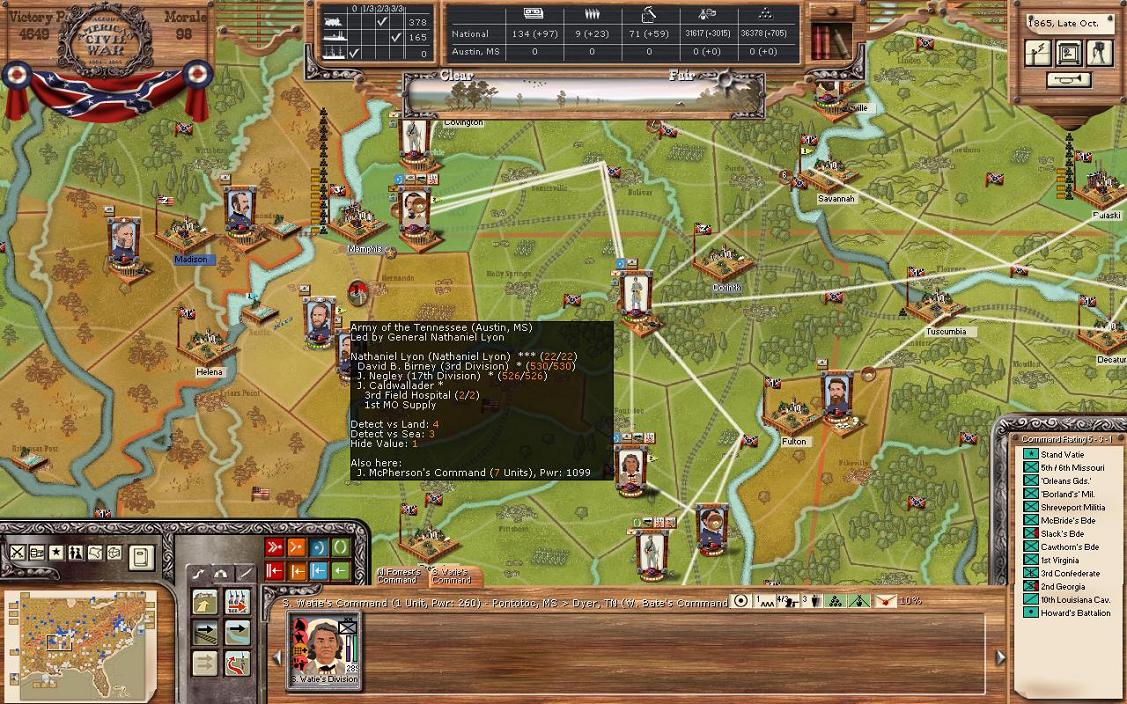 Sherman is gone, but Sheridan still commands a small force. Forest caught up with them and captured a cavalry regiment. At this point, I’m going to split Forest force into. Watie’s division will go to Dyer TN to take over the defences there. Forest will still target what is left of Sheridan’s force. The Union has moved 4 divisions into Austin MS. Also a fleet has gone into the harbour.