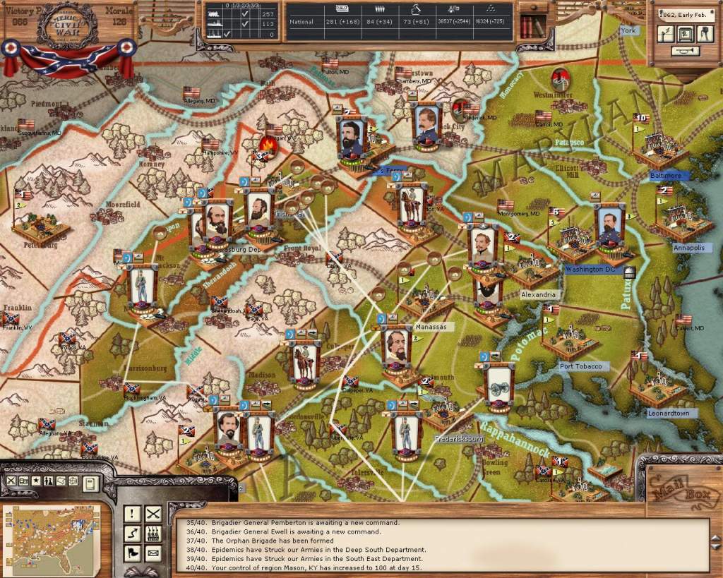 I have the next turns report ready to write which should answer a few questions, especially about Grant and St Louis. I'm not counting my chickens at Washington yet either as there is one move that if successful would force me to abort the siege. I'll get on with the report...