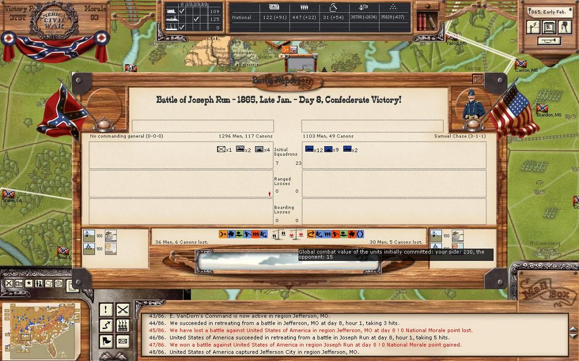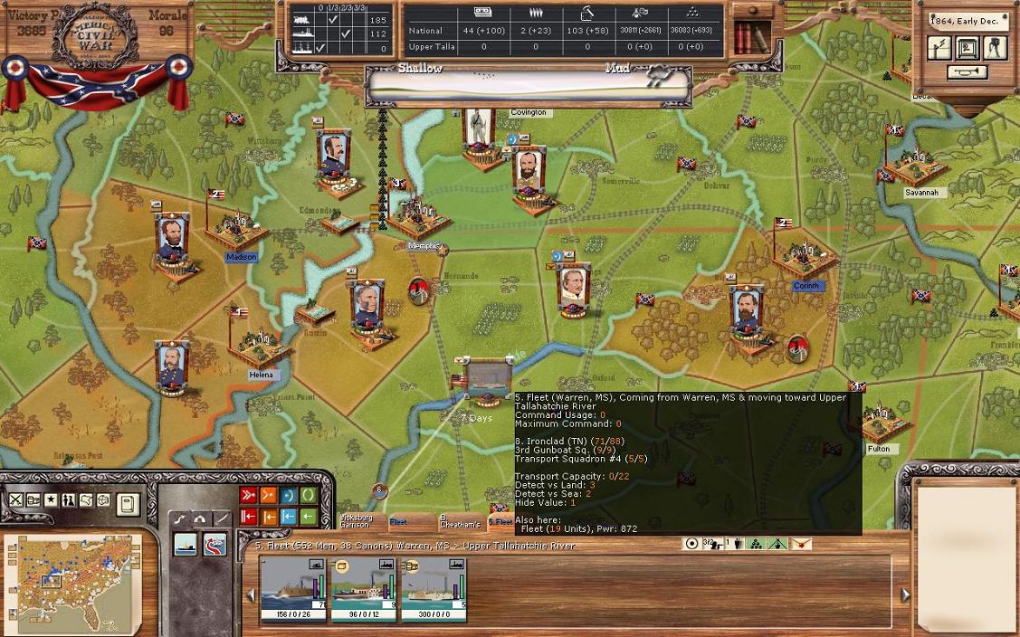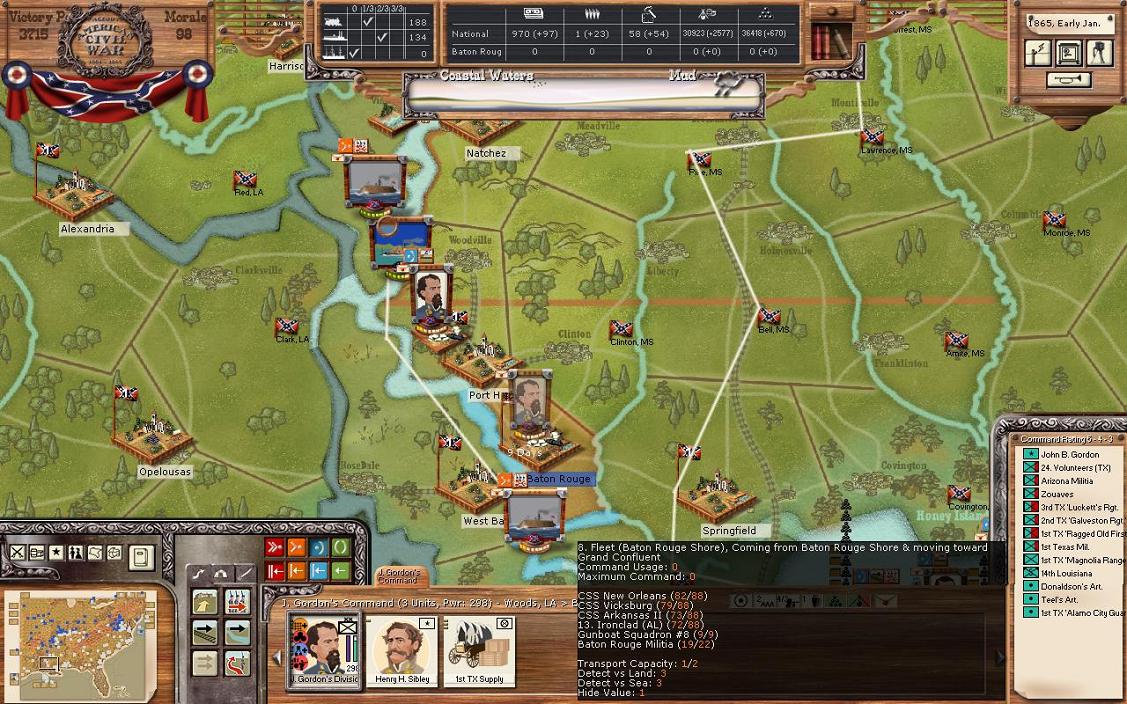Some interesting movement has happened here. Gordon’s division made it to Port Hudson and took over the town without a fight. However, they barely beat the Union fleet at the river crossing. This is interesting as I didn’t know where the Union fleet went and it has now reappeared. By using “previous turn replay” I can see that the fleet must have come from Little Rock. Cheatham’s force in Vicksburg hit the Union fleet pretty hard with 49 hits. This has dropped the strength of the Union fleet to “yellow”. My best guess at this point is that Mortar will attempt an evacuation of Lyon’s force who has recovered to power of 250 and supply is at the orange colour. The supply for Lyon went up since Port Hudson had about 100 GS in the town. My militia unit made it onto the New Orleans fleet without a fight. I’m going to have Gordon dig into Port Hudson, but I’d be very surprised if Lyon attacks there. I think the evacuation is the most likely scenario. The Union could attempt some wild manoeuvre of going south, beating the smaller New Orleans flight, running the heave guns of New Orleans and taking a fort at the mouth of the Mississippi. Or even go for Mobile or the lightly defended southern Texas. However, I think that is not likely, so here is what I’m going to do. I’m going to leave the New Orleans fleet as is with defend and retreat. My Mississippi fleet from Vicksburg with power of 1115 will target the Union fleet on conservative attack. It takes 11 days to reach the Union fleet in its current location; it might not make it this turn. However, if the Union fleet moves north on the Mississippi, then a battle will most likely happen.