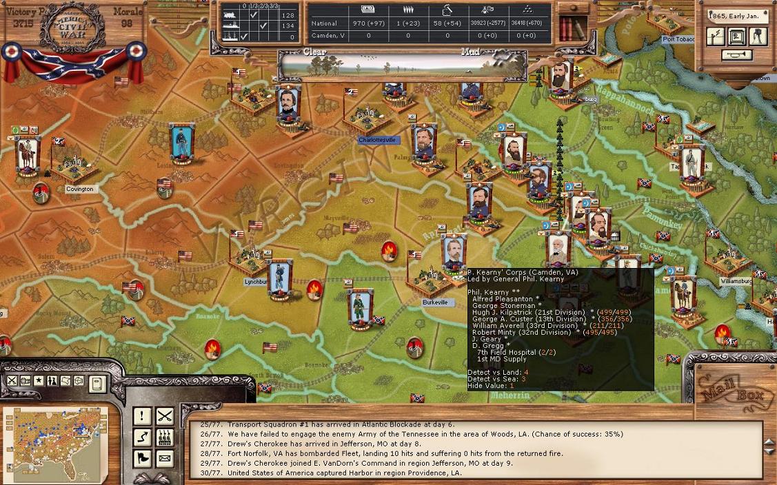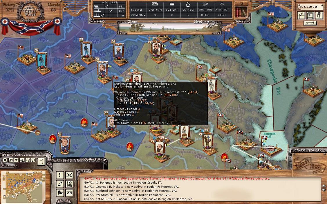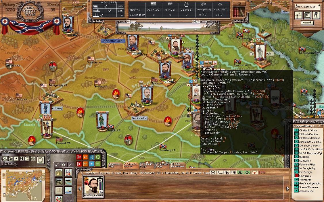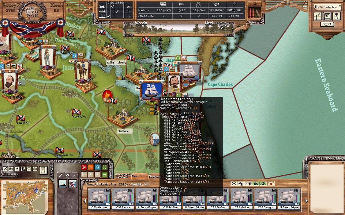 It was a pretty good turn for industrialization; Petersburg +24 and Hampton +14. There were no battles, but Mortar has surprised me by going straight for the east west Virginia RR. Clearly, my plan to open up some additional supply that way isn’t going to happen. The big move is that Kearney’s corps has moved in Burkeville. I also made a mistake in my division restructuring. I wanted to send Winder’s division from Richmond to Petersburg, but I seem to have forgotten to do that. So, Petersburg is virtually undefended. Winder’s division from Richmond will go to Petersburg and be there in 2 days, which should be enough to stop any attack that would happen there, although I don’t really expect an attack as I think he knows I have quite a large force in Richmond ready to move. Basically, Trimble’s brigade fled Burkeville back to Petersburg. I’m pulling the cavalry unit in Campbell back to Petersburg. And I’ll let the cavalry unit in Covington to rest 1 more turn. In addition to sending Winder to Petersburg, I’m sending a small brigade from Longstreet to Lee and a small brigade from Jackson to Petersburg. The Union now has power of 6000 in the 3 regions of Buckingham, Appomattox, and Camden. If the Union wanted, they could bring that all that to bear against Lee. My fleet is still in Norfolk and is nearly 100% (current power 2158). The Union has rebuilt all the RRs in WV, I still hold Grafton un-garrisoned there. Supply in Richmond is 266 / 1981