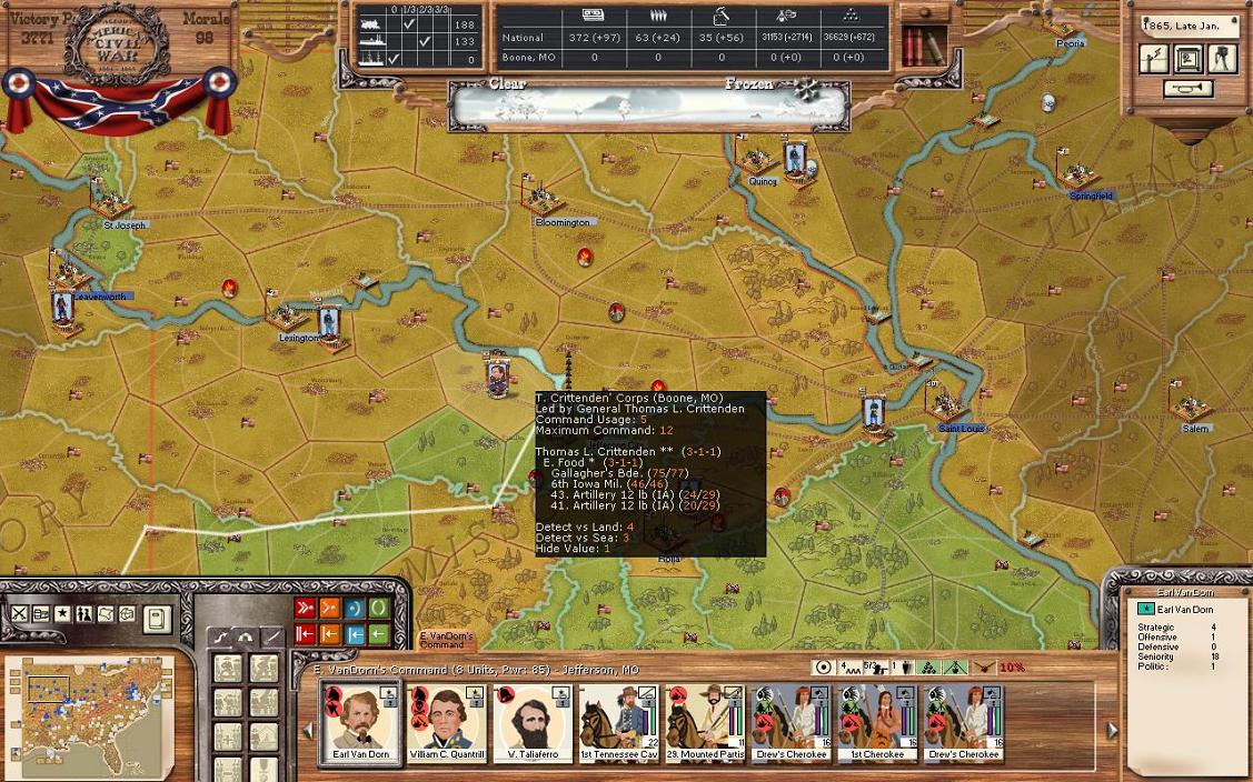 There was a little action in Missouri. My Indian unit destroyed the RR and moved to Union. The Union took back Bloomington. This clearly show the Union isn’t going to give me a free pass in this far flung theatre. Furthermore, General Crittenden with a brigade, militia, and 2 batteries has showed up across the river near Bloomington. I can only imagine they are coming to Jefferson City. On one hand, I could raise a militia unit and battery in Jefferson City, but I’m hesitant to put resources into a region which I can’t really believe is going to help me hold off the union. Jefferson City only provides +4 in GS and I can’t industrialise in the state. This leads me to believe that putting non cavalry units in there would lead to them starving, even if I could hold off the Union. This turn the Indian unit will destroy the RR and head back to Jefferson City. I’m also sending 1 more general to Jefferson City to bring a full complement of 4 generals there.
