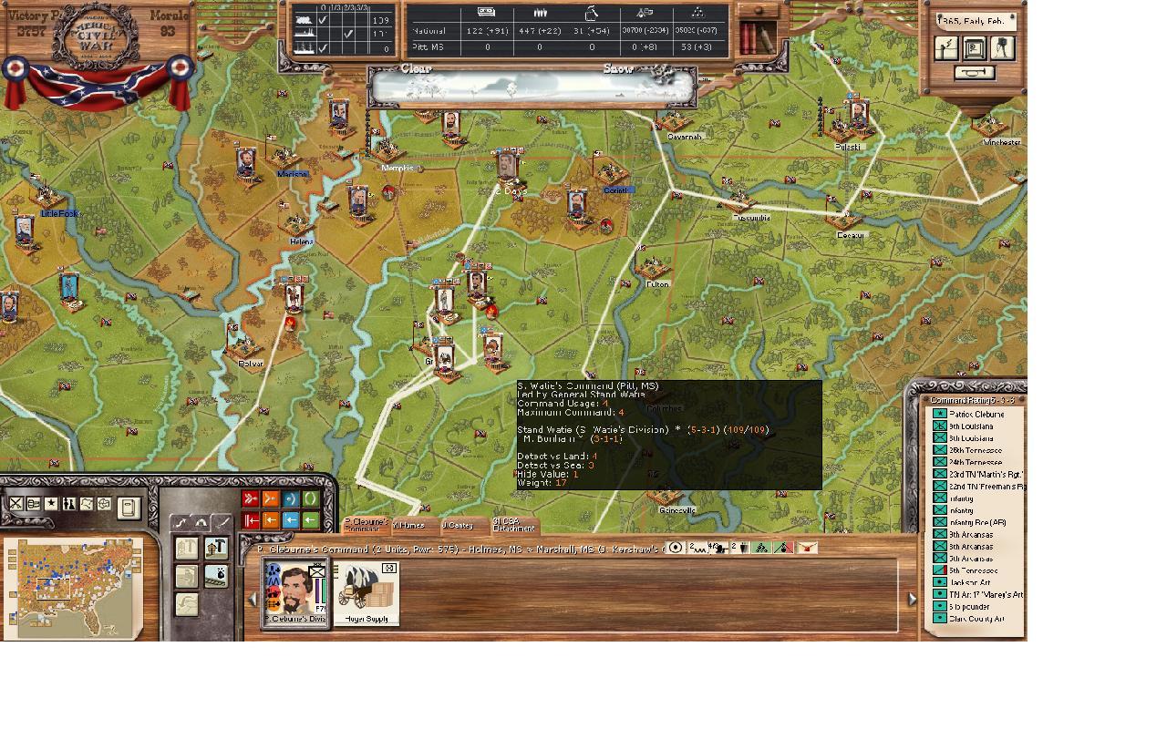 In northern Mississippi, my blocking fleet has arrived and Kershaw continues to dig in with 1 division. I’ve noticed some more movement by the Union into Austin MS. There is now 2 corps there with a total of 3 divisions I believe. Unfortunately, the weather is still good in Mississippi. I'm sending Cleburne's division from Henry TN to reinfoce Kershaw's new position. The position in Henry is unlikely to be attached since the Union would have to attack across a river for Grant to join and Henry is a forest with mud.