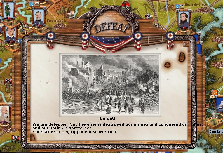 Gen. Monkey-Bear wrote:That's a very interesting situation you have here. Of course as your audience member I want the game to continue so I can read the AAR, but in reality I think I would have just continued the game as is (before you pointed the better move to your opponent). Both sides made blunders in real life, and perhaps the failure to attack on Washington could be seen simply as General Lee losing his nerve at a critical time. Of course I think your decision to rewind a few turns was also good![]()
