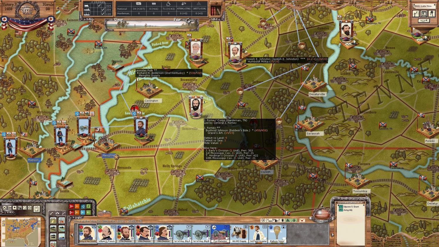 The army is beginning it's advance on Bowling Green. Unfortunately, a few turns ago I had river transports on the way to construct a depot at Henderson, kY, however they were sunk! I'll repair the rail lines as I move south and build a depot later. I think there is ample supplies for a few months anyway...