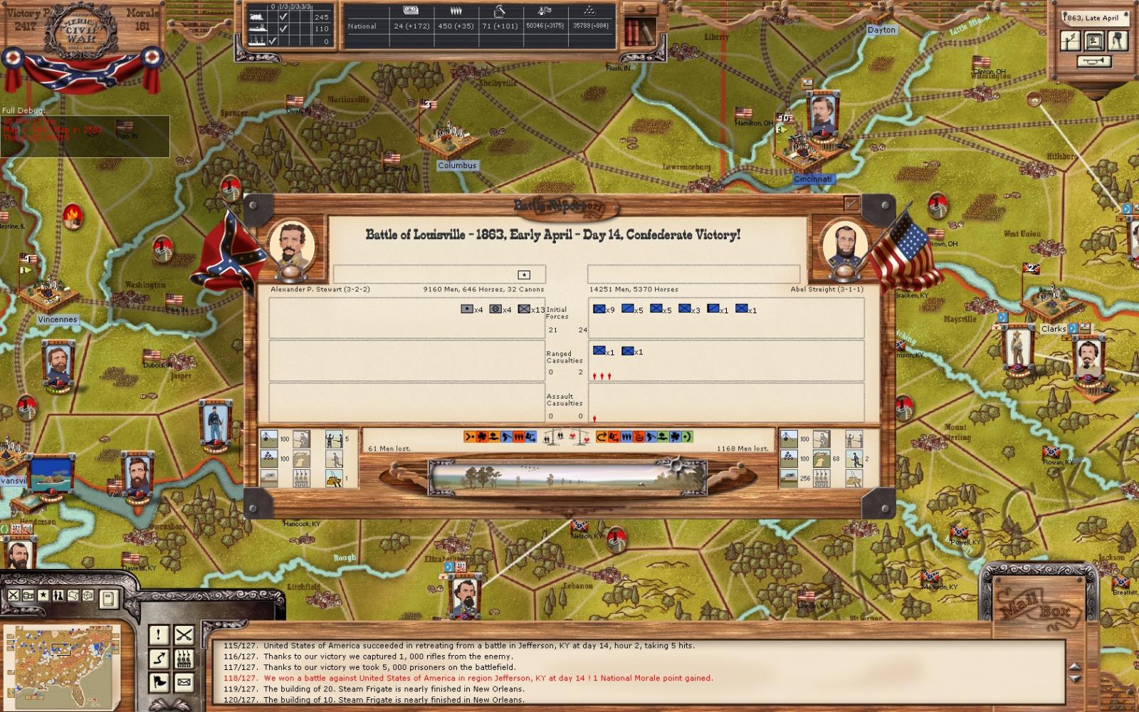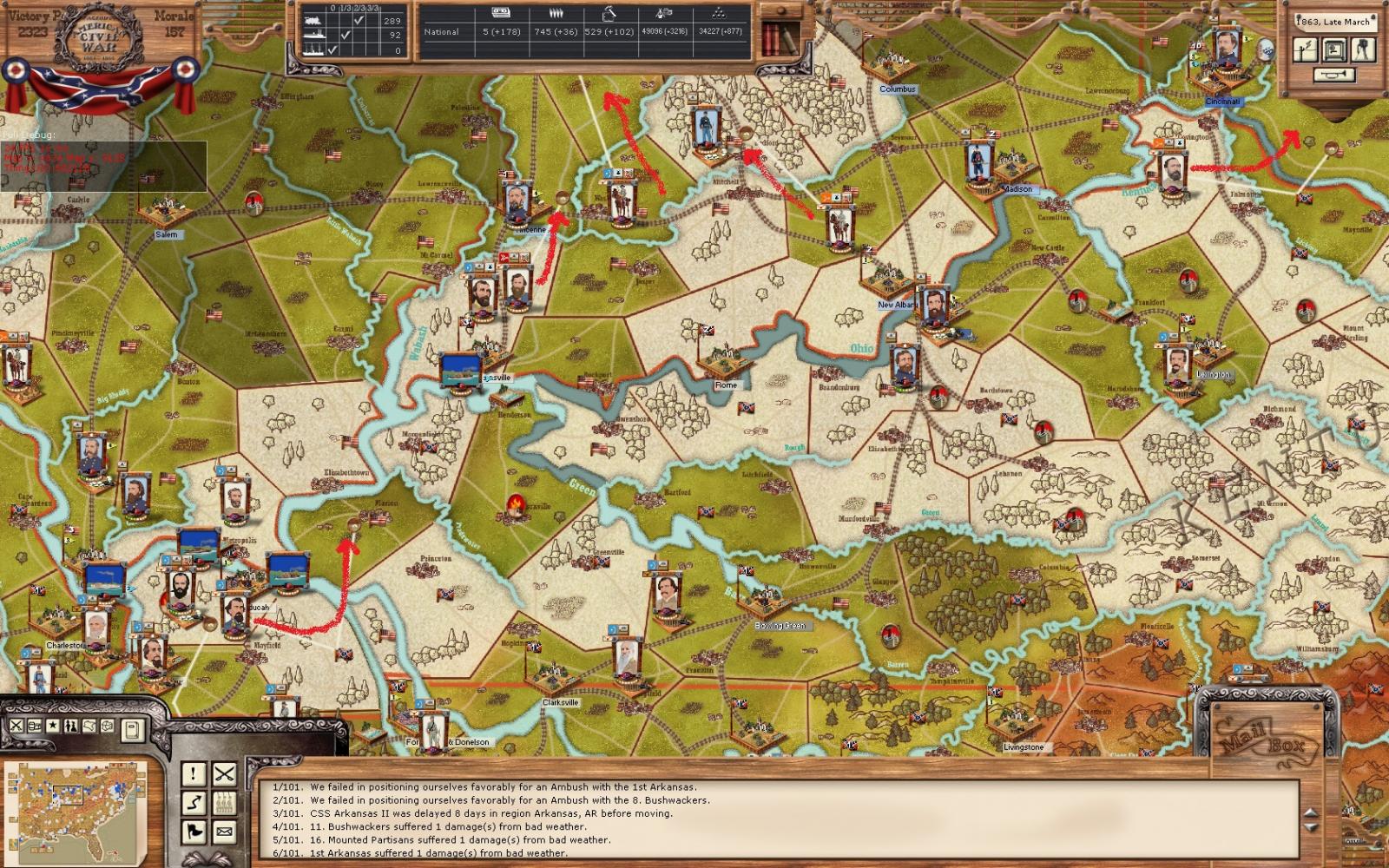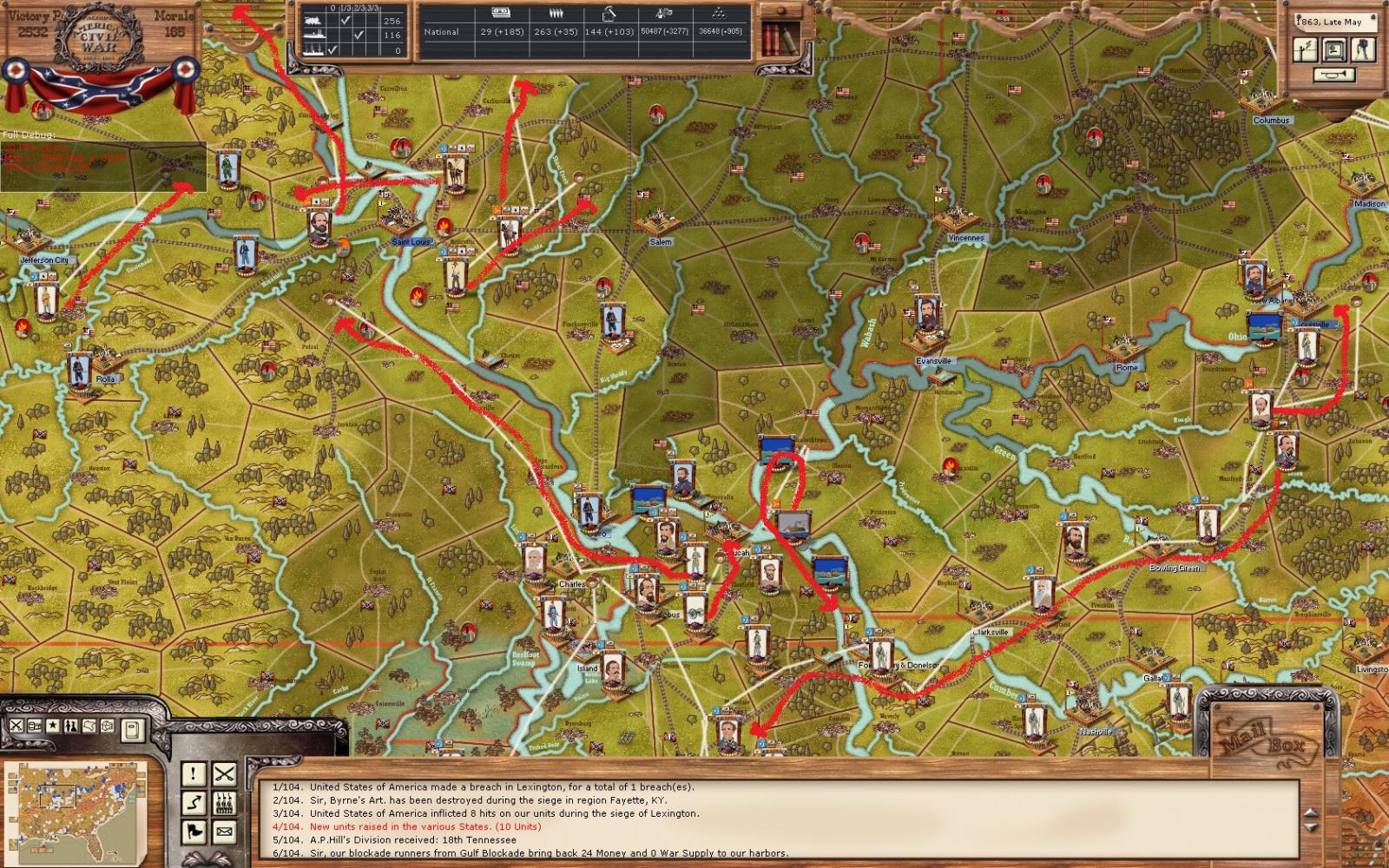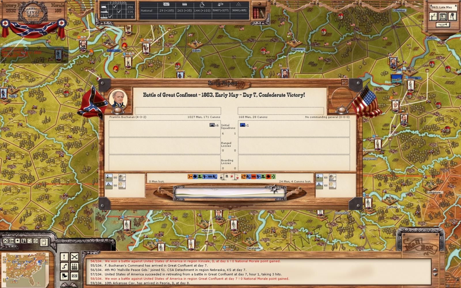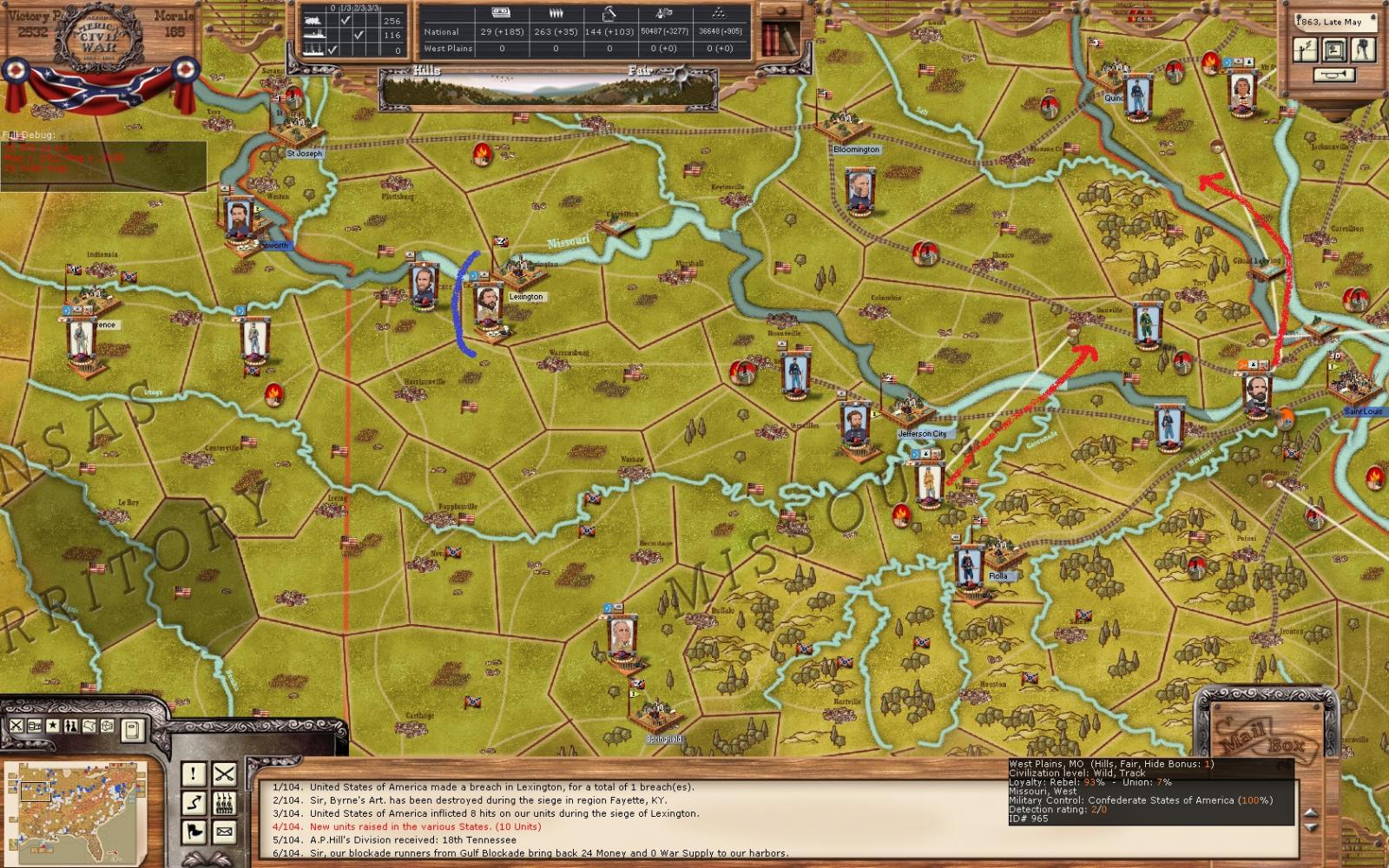 regarding your attack on Cairo, don't you fear that this will risk getting some of your forces stranded on the north side of the river if his boats prevent you from crossing back ? In that case you will lose troops in the same way he lost some... I would put the priority on stabilising that front and then either try to push him back accross the Ohio in Kentucky or Go for a big gambit an try to take St Louis an break his back in the transmississippi theater.. Anyway things are going really great...