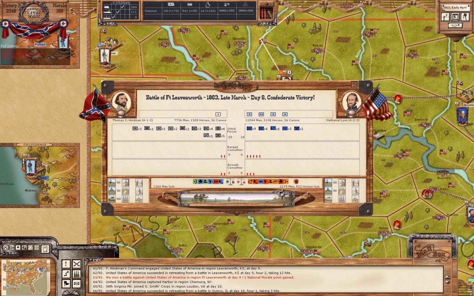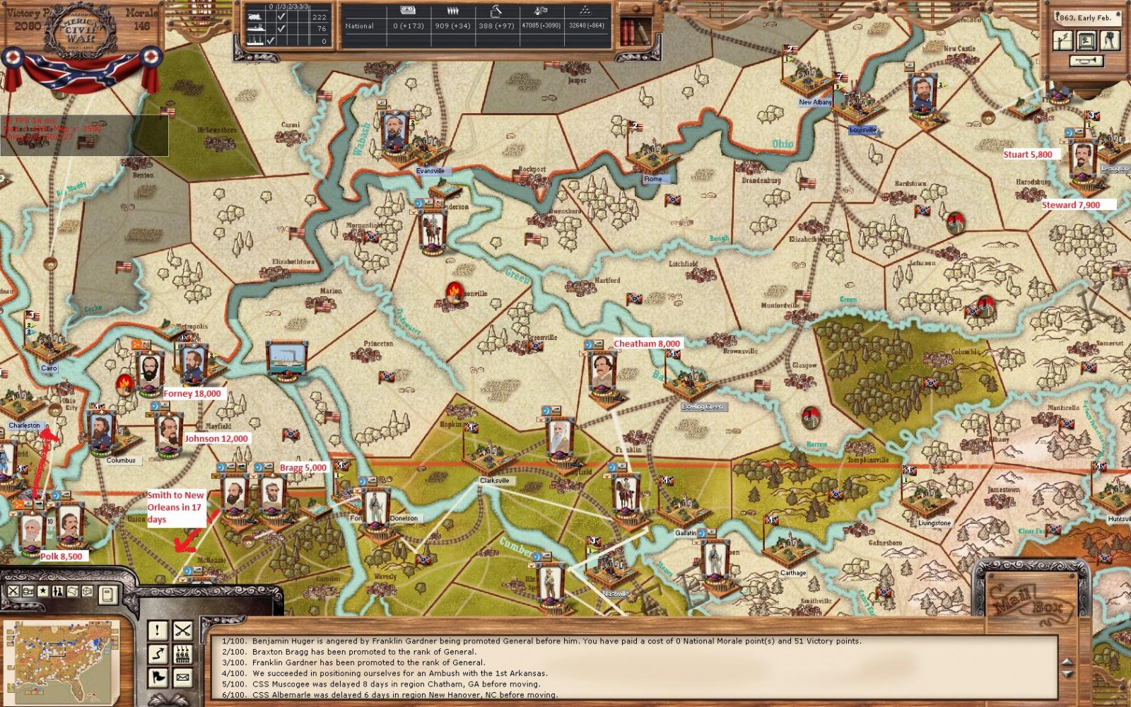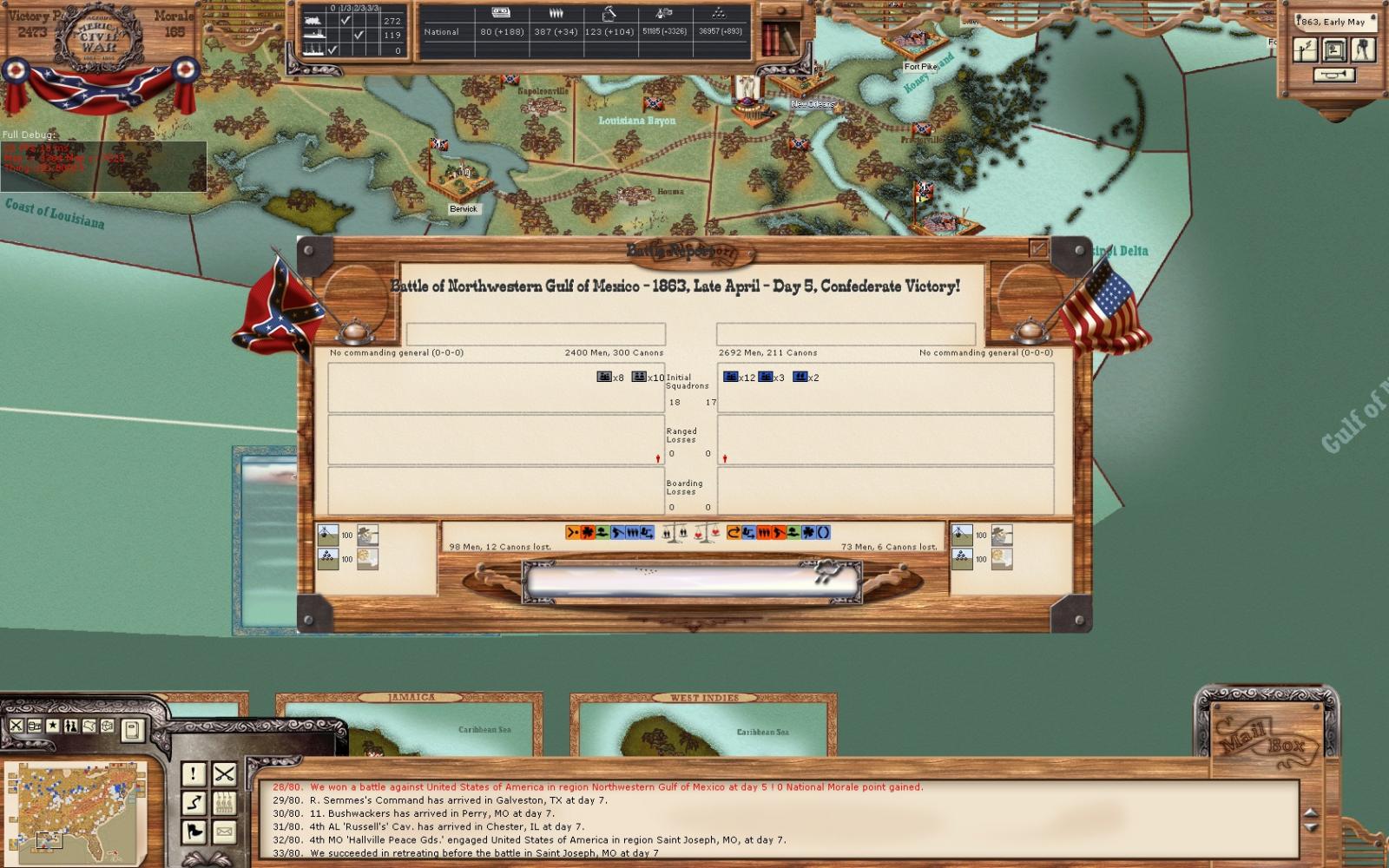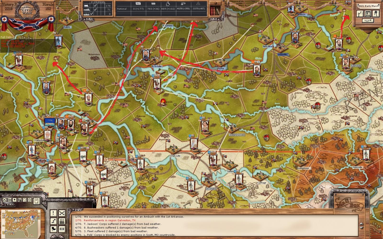 regarding your attack on Cairo, don't you fear that this will risk getting some of your forces stranded on the north side of the river if his boats prevent you from crossing back ? In that case you will lose troops in the same way he lost some... I would put the priority on stabilising that front and then either try to push him back accross the Ohio in Kentucky or Go for a big gambit an try to take St Louis an break his back in the transmississippi theater.. Anyway things are going really great...