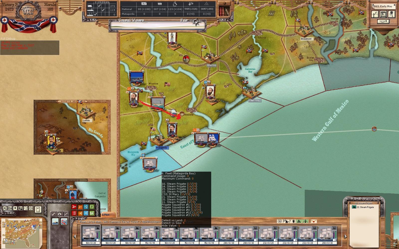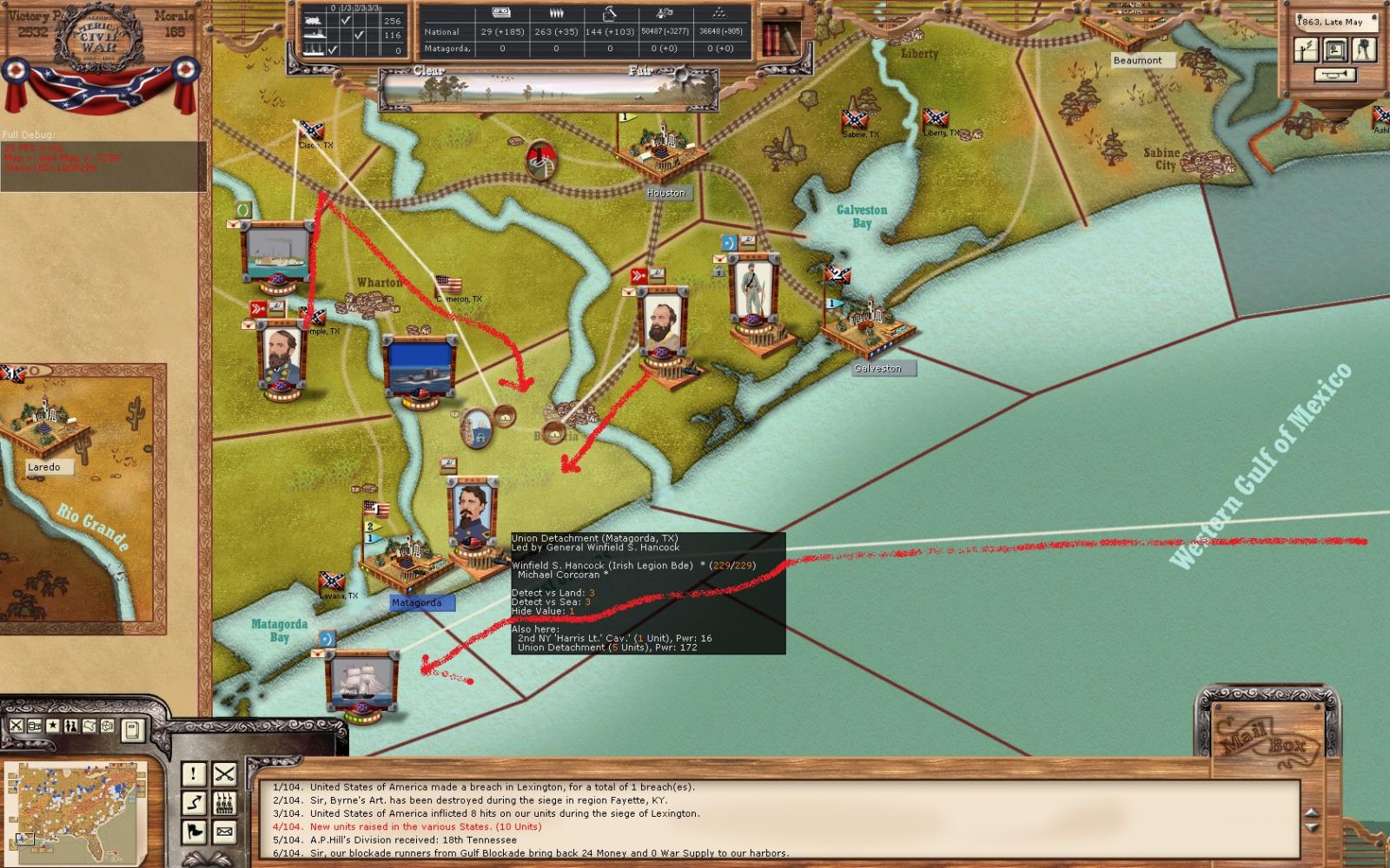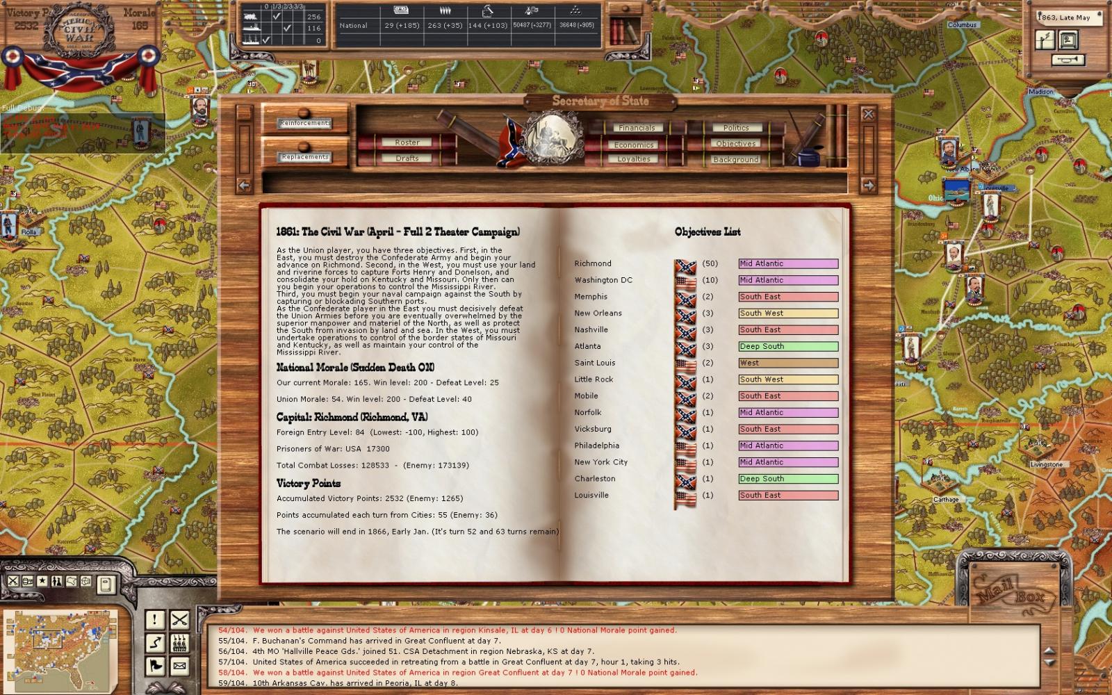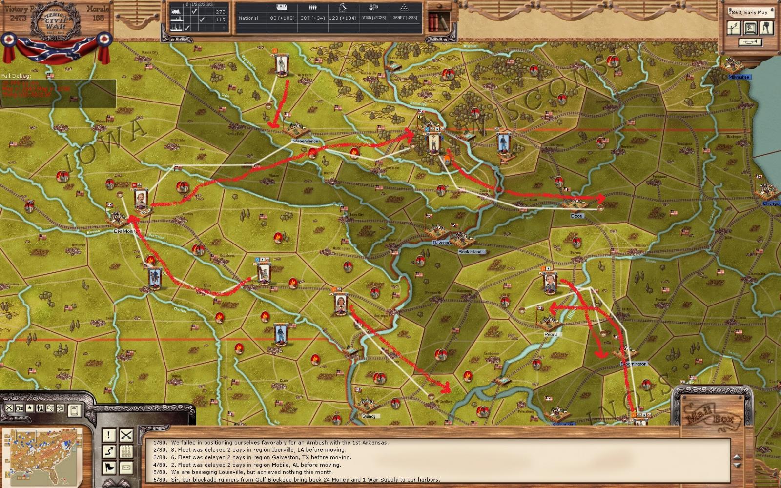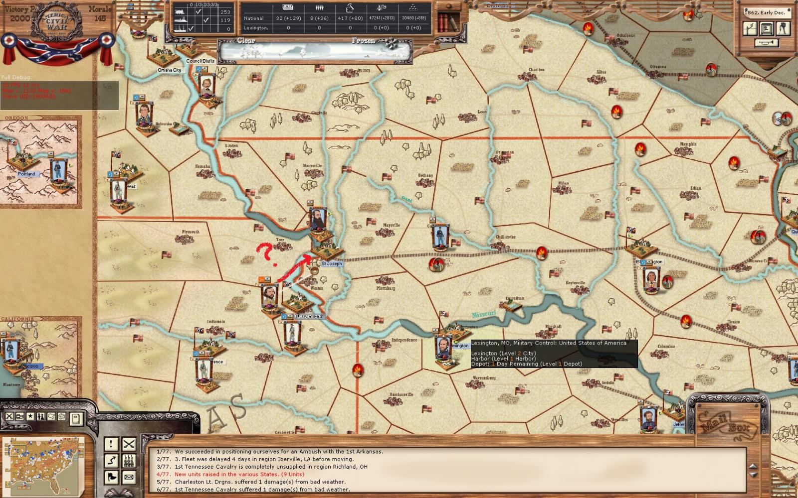 regarding your attack on Cairo, don't you fear that this will risk getting some of your forces stranded on the north side of the river if his boats prevent you from crossing back ? In that case you will lose troops in the same way he lost some... I would put the priority on stabilising that front and then either try to push him back accross the Ohio in Kentucky or Go for a big gambit an try to take St Louis an break his back in the transmississippi theater.. Anyway things are going really great...