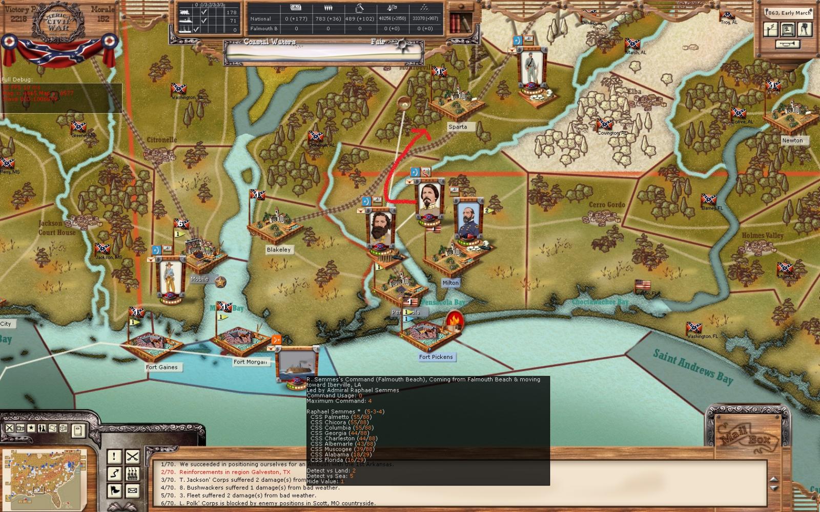 This western Kentucky campaign is the highlight of the war so far. Funny how Virginia is a peripheral theater in this game. It is a mistake from him not to put pressure on you there, as it allows you to have enough forces in the west were there is more territory to cover and he should be able to ountmanouver you, as well as in the gulf where you have been able to react to his invasions.. Had you been under sustained assault in Virginia you would have 4 or 5 divs more overthere rather than available somewhere else...