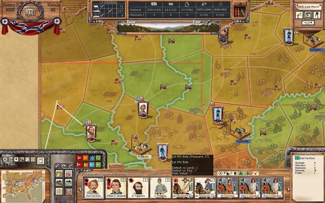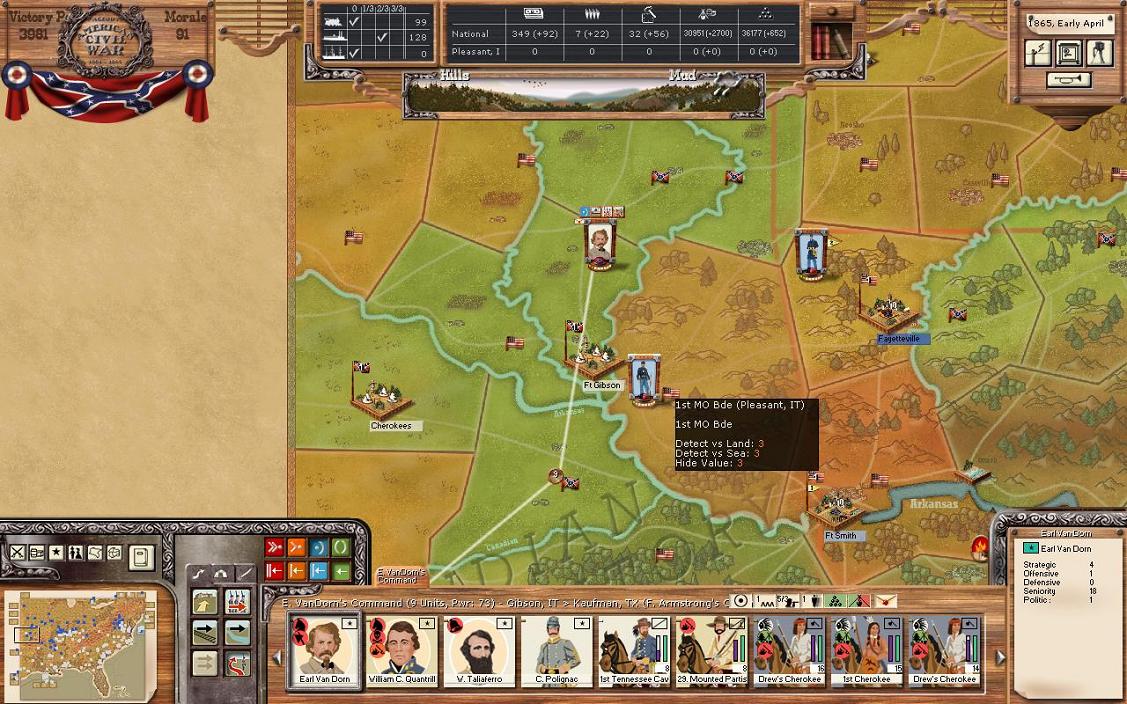 More on those exciting details later in the post! In Missouri, actually the Indian Territory as there are now no CSA forces in Missouri, which is a bit sad. Van Dorn and his 1,500 cavalry made the final journey to Ft. Smith. You might remember that this force was being chased by Crittenden’s corps. Crittenden’s corps didn’t move this turn and received reinforcements (a militia unit) in Carthage MO. The second Union move in this region is that the 1st MO brigade (Union) left Fayetteville on what appears to be a move to Ft. Smith. Van Dorn’s force is tired, so I’m setting them to rest and defend this turn. I don’t think Crittenden’s force could make it all the way there and I don’t believe the 1st MO brigade would be strong enough to defeat Van Dorn’s cavalry force. However, I could be wrong.