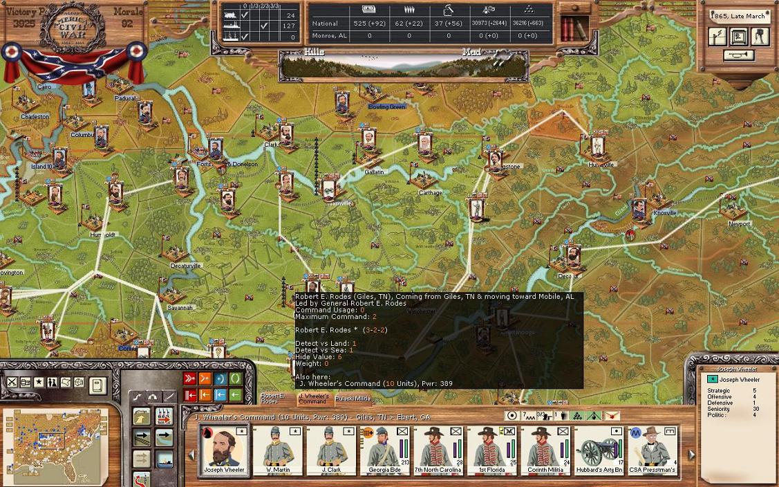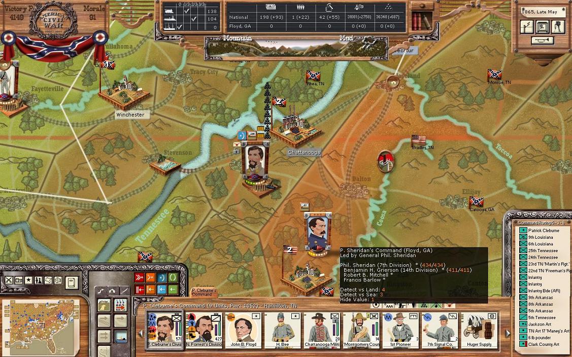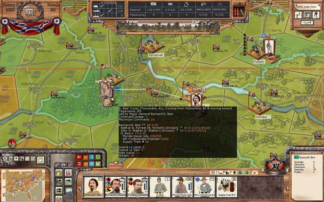 General Bee arrived in Pulaski and my partisan unit took back Decatur. Cleburne’s force still controls Chattanooga. Bee and Forest’s cavalry division will go to Tuscumbia. Cleburne’s division will hold Chattanooga. If we are lucky, Bee and Forest can combine next turn to attack Foster’s 1 division corps in northern AL. I’ll then have to deal with Sheridan later, if he is still around. I think Sheridan might head back north through TN to KY this turn, so we’ll see.